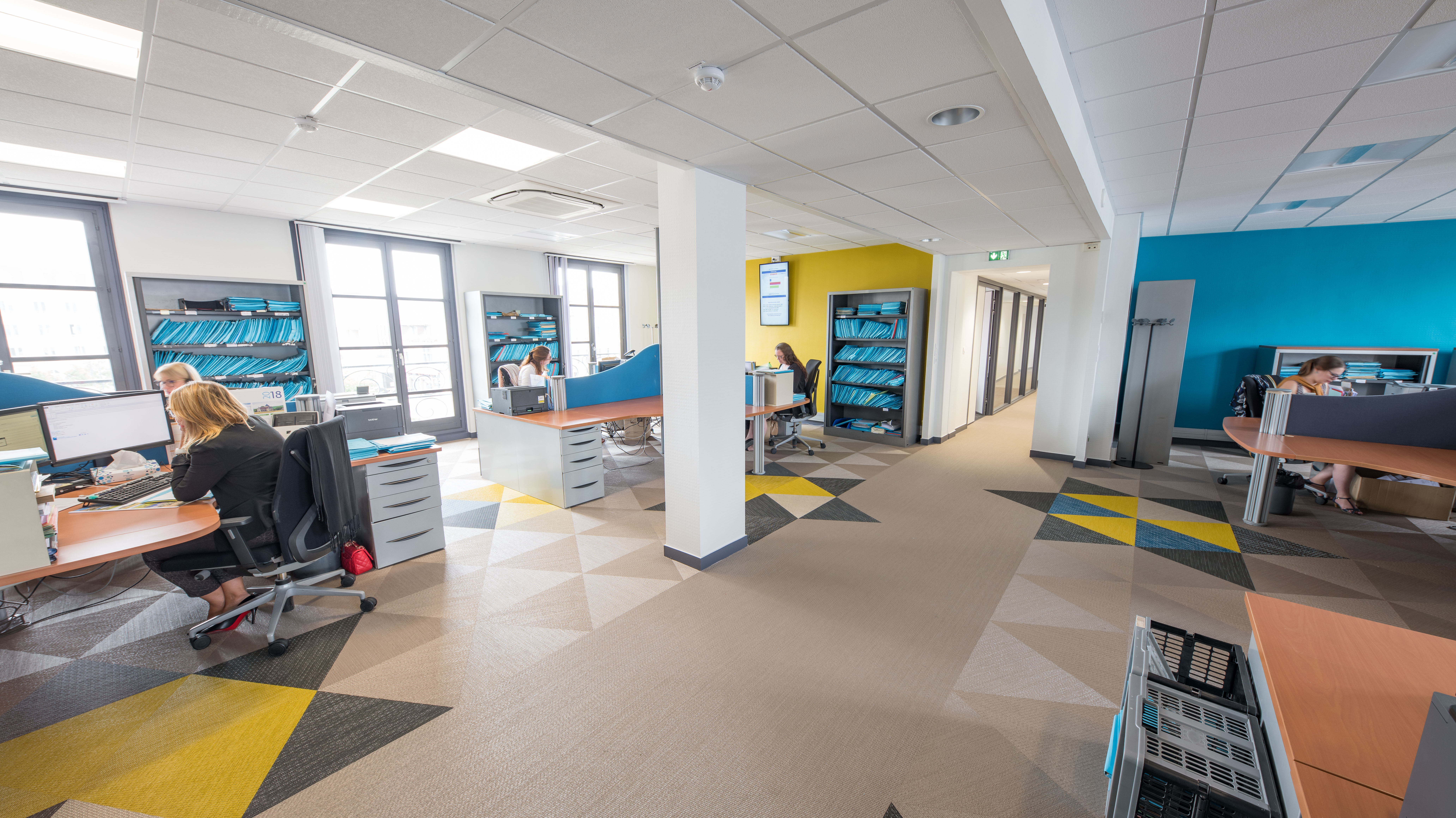 Ambiance jaune et bleue jusque dans les étoiles au sol choisie par les collaborateurs de SATISPRET