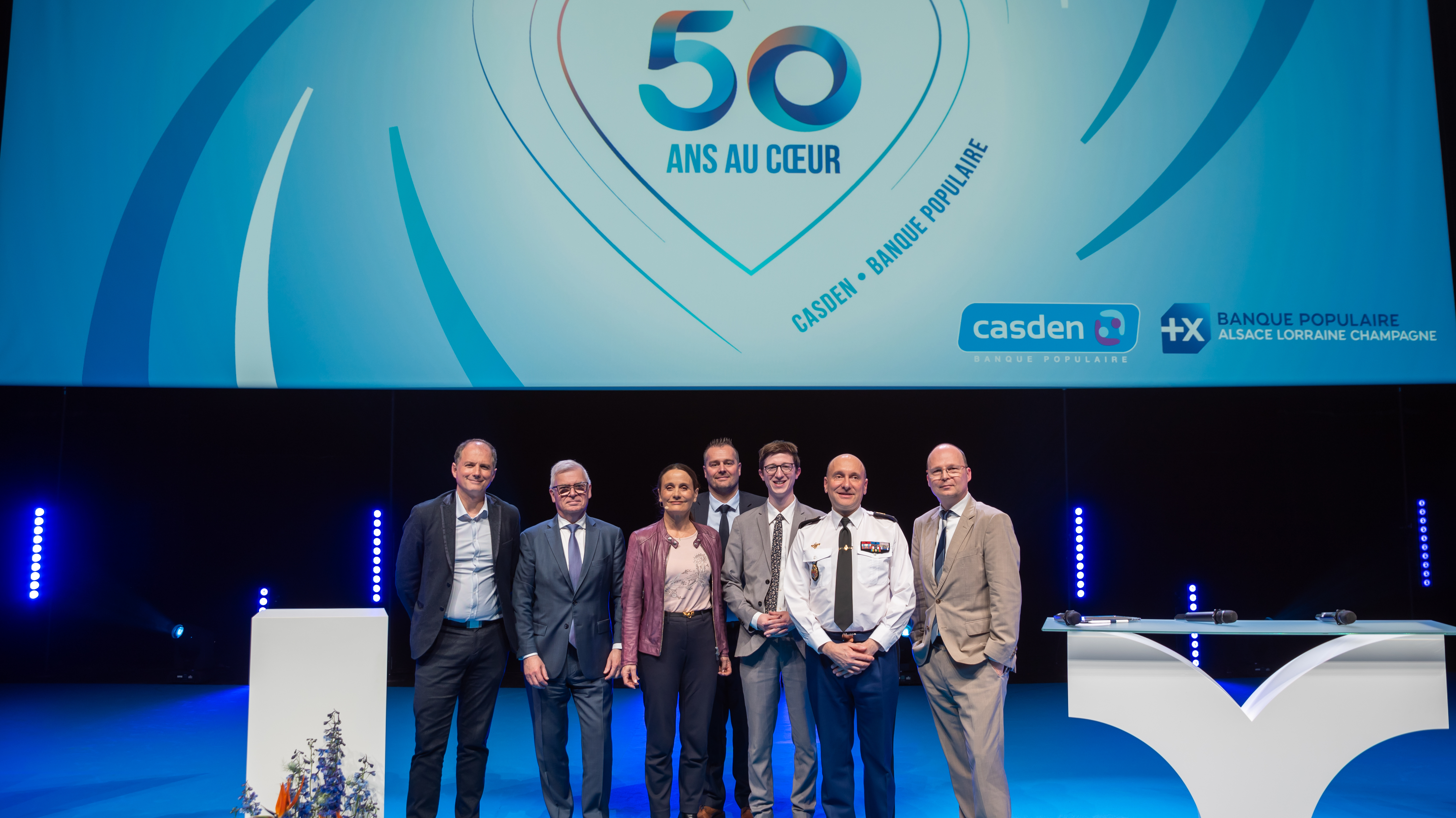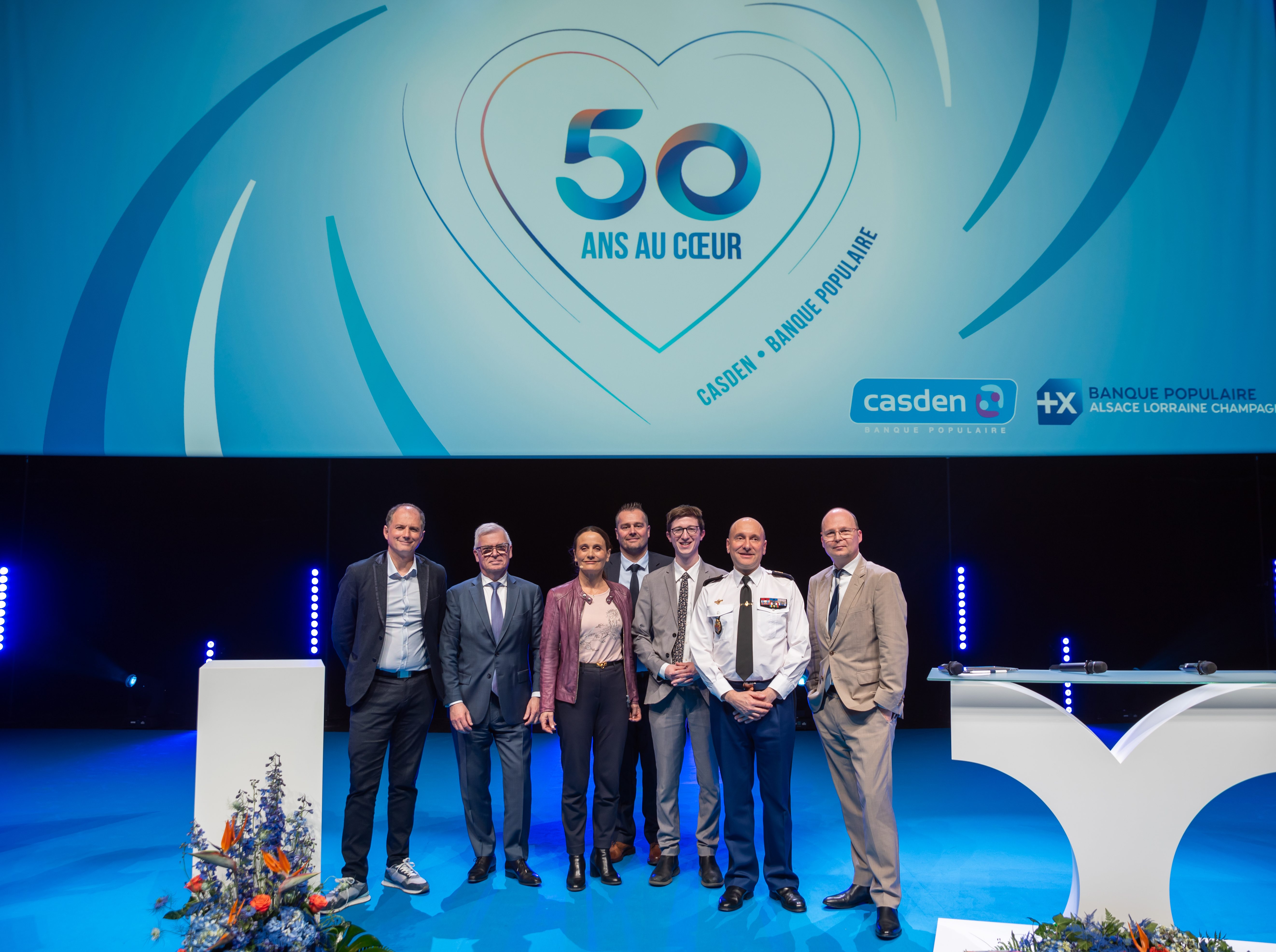 De gauche à droite : François BRUN, Président du Conseil d’Administration de la CASDEN Banque Populaire, Dominique GARNIER, Directeur Général de la Banque Populaire Alsace Lorraine Champagne, Isabelle RODNEY, Directrice Générale de la CASDEN Banque Populaire, Sébastien MEYER, Inspecteur d'Académie - Inspecteur Pédagogique Régional - Éducation Physique et Sportive, Antoine BOLMONT, Directeur référent du Pôle Inter-Établissements de Médecine, Général Marc PAYRAR, Commandant du Groupement de Gendarmerie Départemental de la Moselle et Patrice KAUSENER, Délégué National CASDEN du Territoire Alsace Lorraine Champagne.
