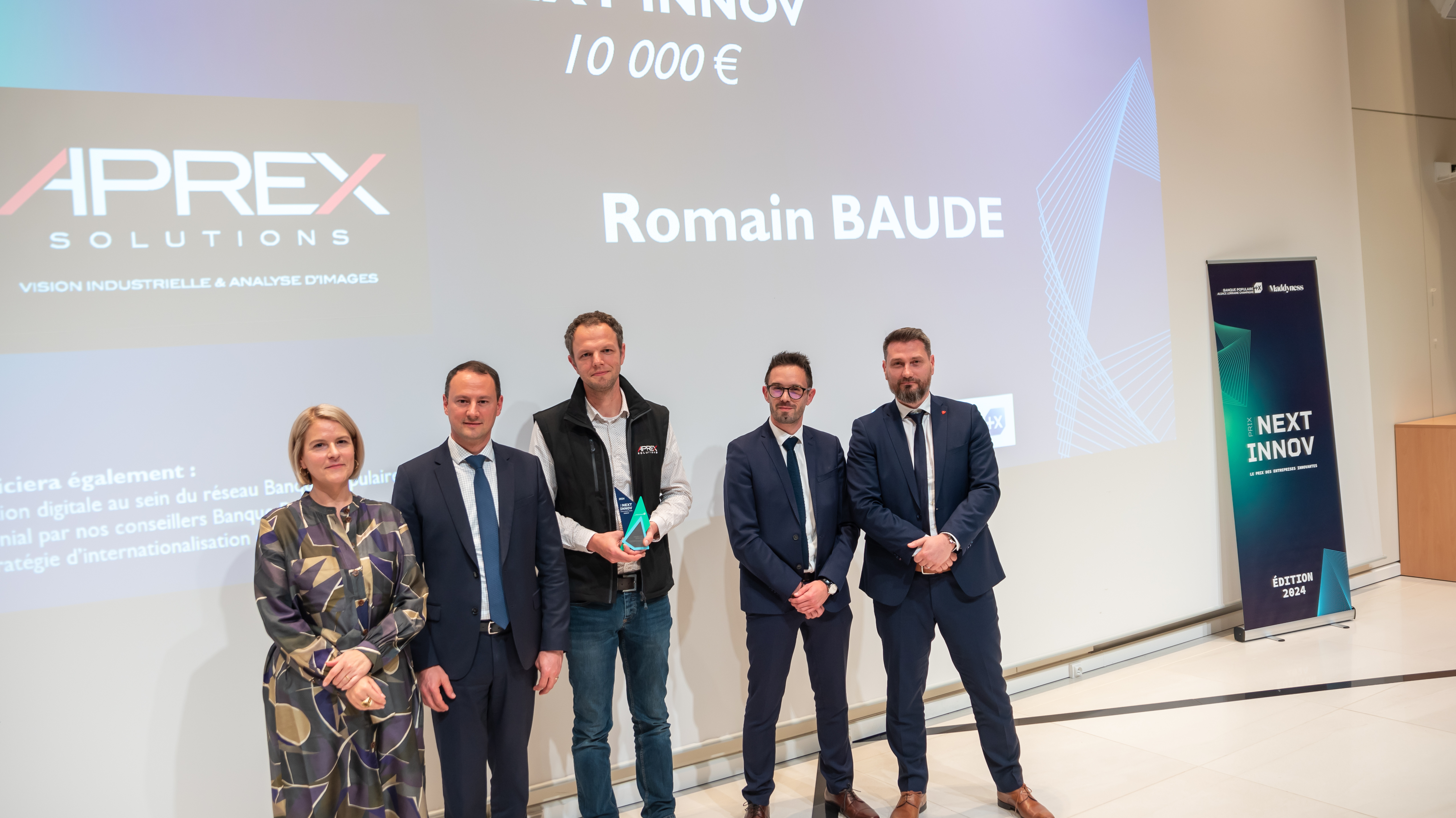 De gauche à droite : Mireille WETZ, Chargée de Mission Innovation & Transition Energétique de la BPALC, Anthony CLEMENT, Directeur Général Adjoint – Pôle Territoires et Clients de Proximité de la BPALC, Romain BAUDE, CEO et co-fondateur de APREX SOLUTIONS, Kevin GEORGEL, Chargé d’affaires PME PMI du Centre d’Affaires Entreprises de Lorraine Sud de la BPALC et Clément PIERRON, Directeur de la succursale d’Essey les Nancy de la BPALC