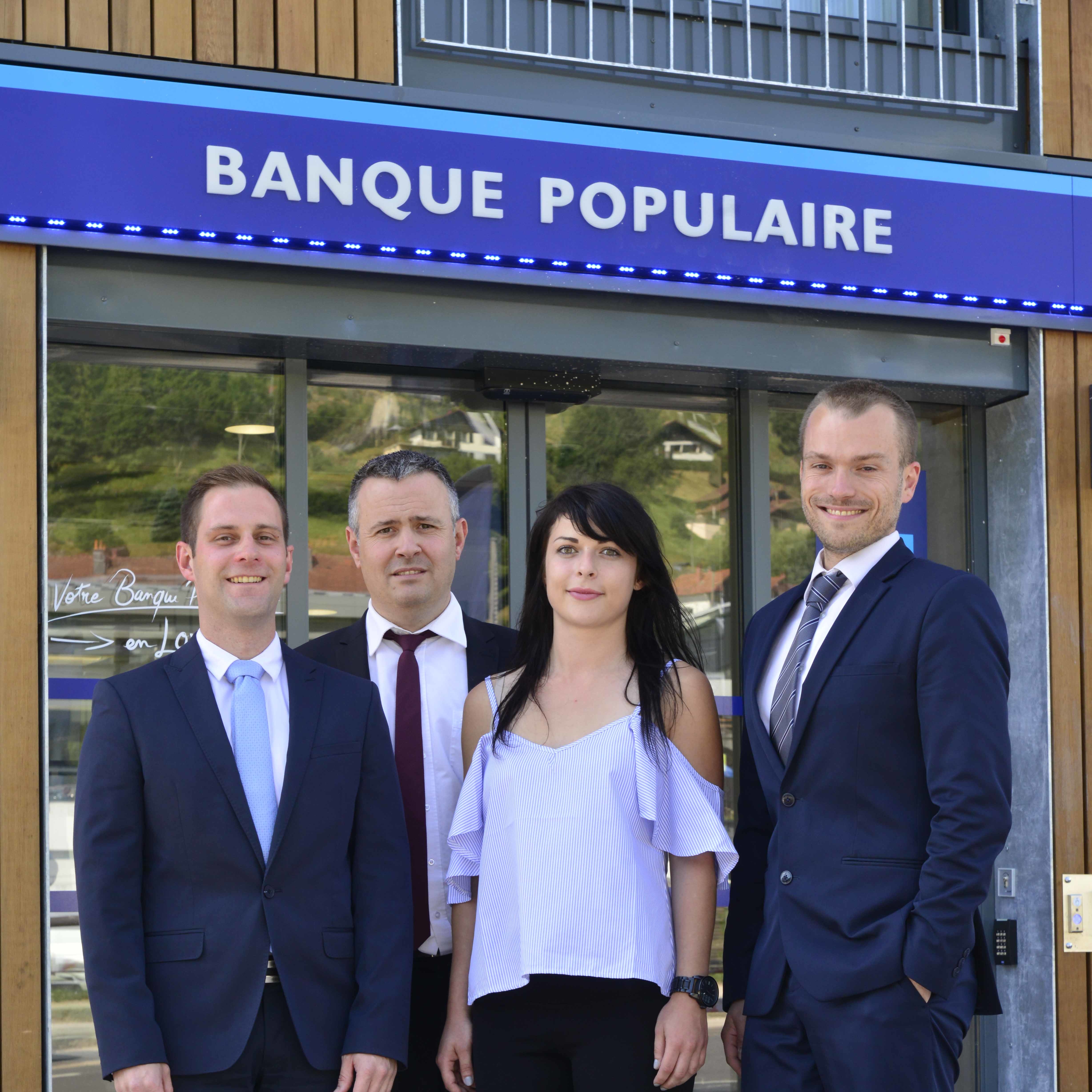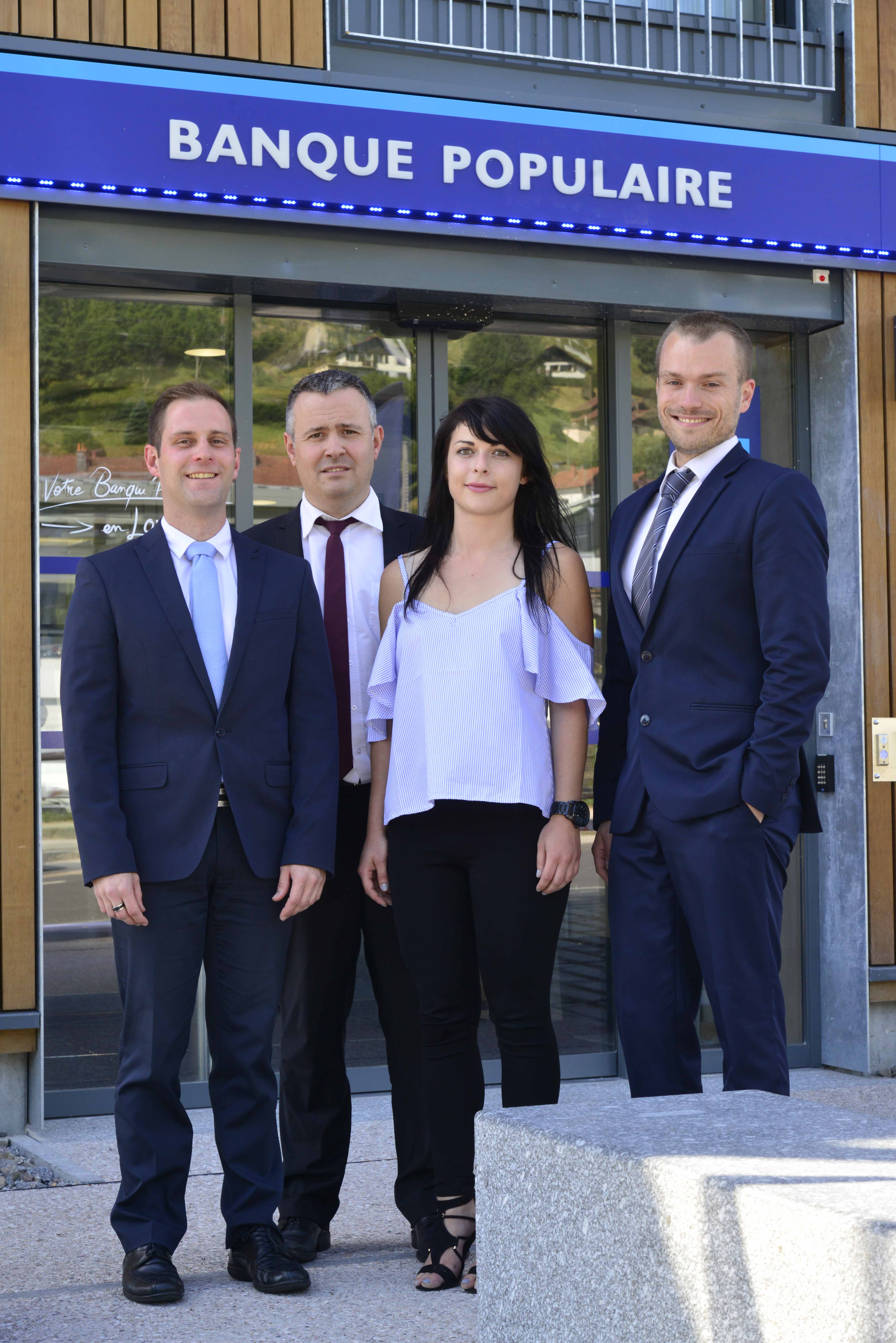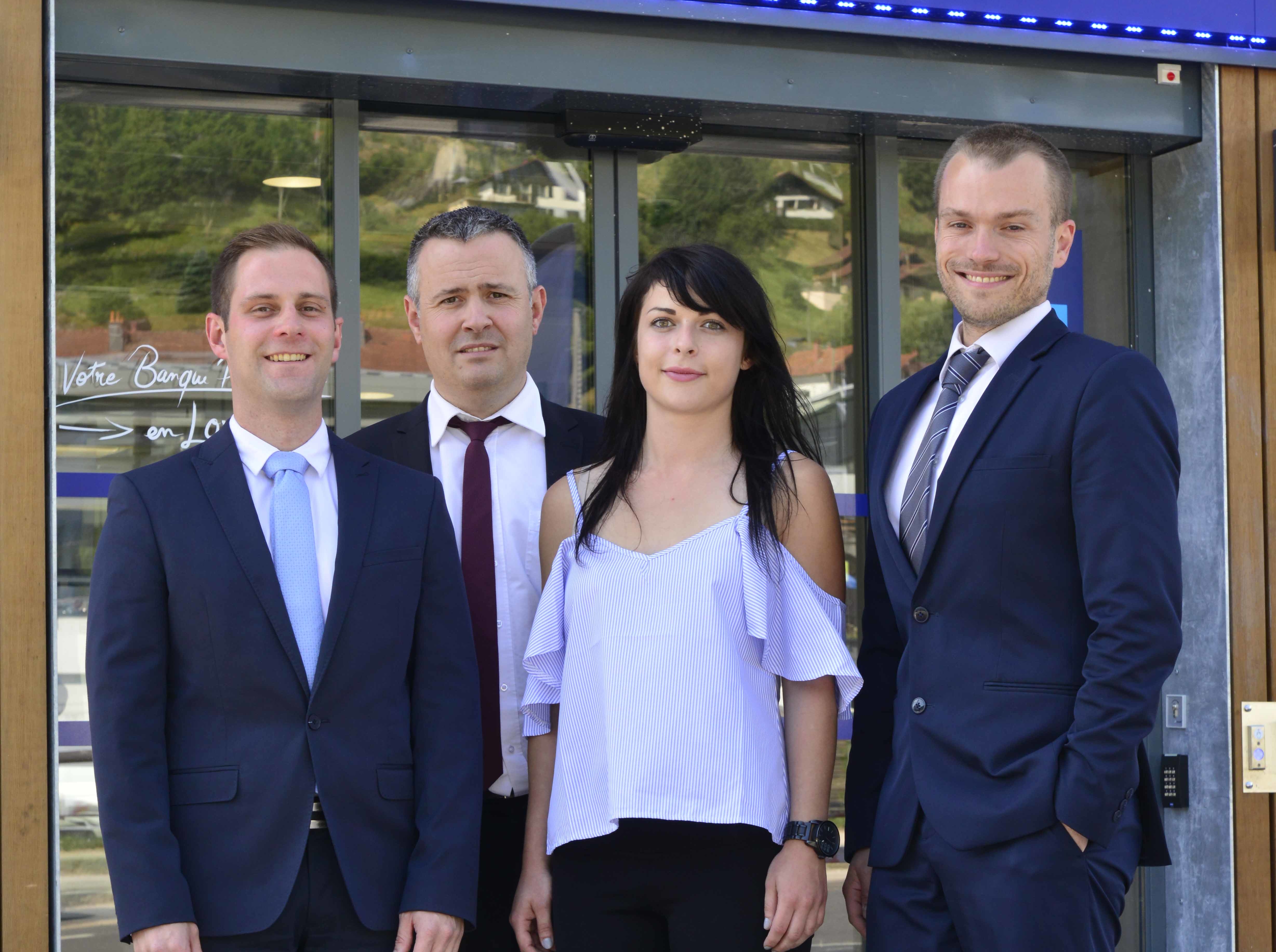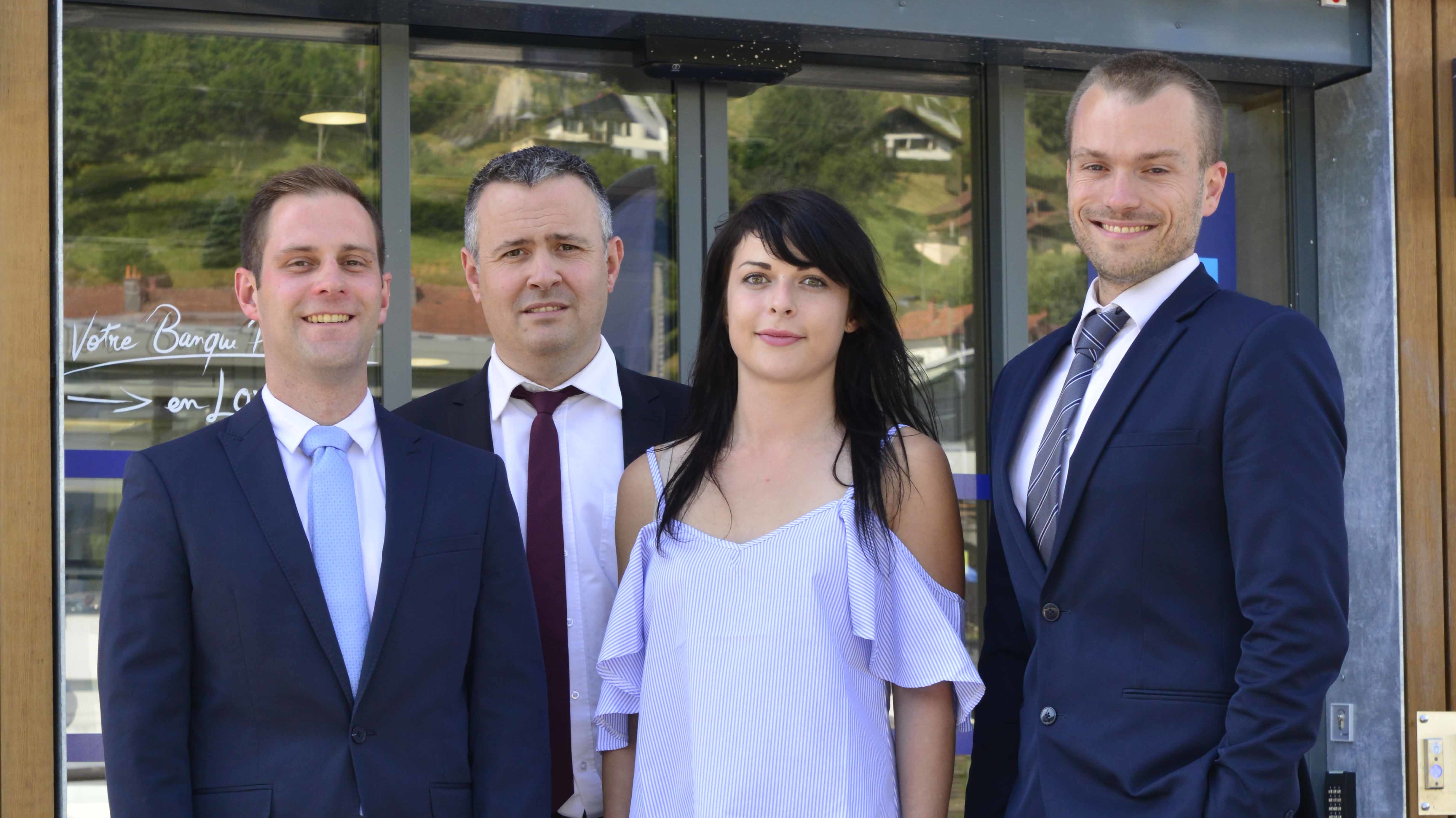 Maxime GUERY, Chargé de Clientèle Particuliers Vincent AUBERT, Directeur d’Agence, Eloïse PERRIN, Conseiller de Clientèle et Sebastien MICLO, Chargé de Clientèle Particuliers
