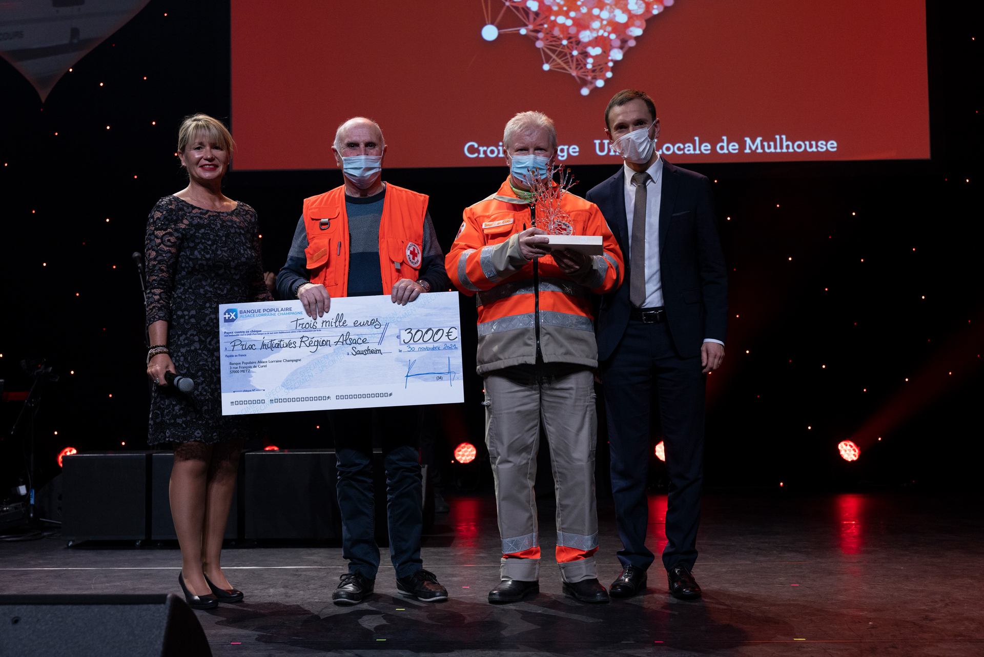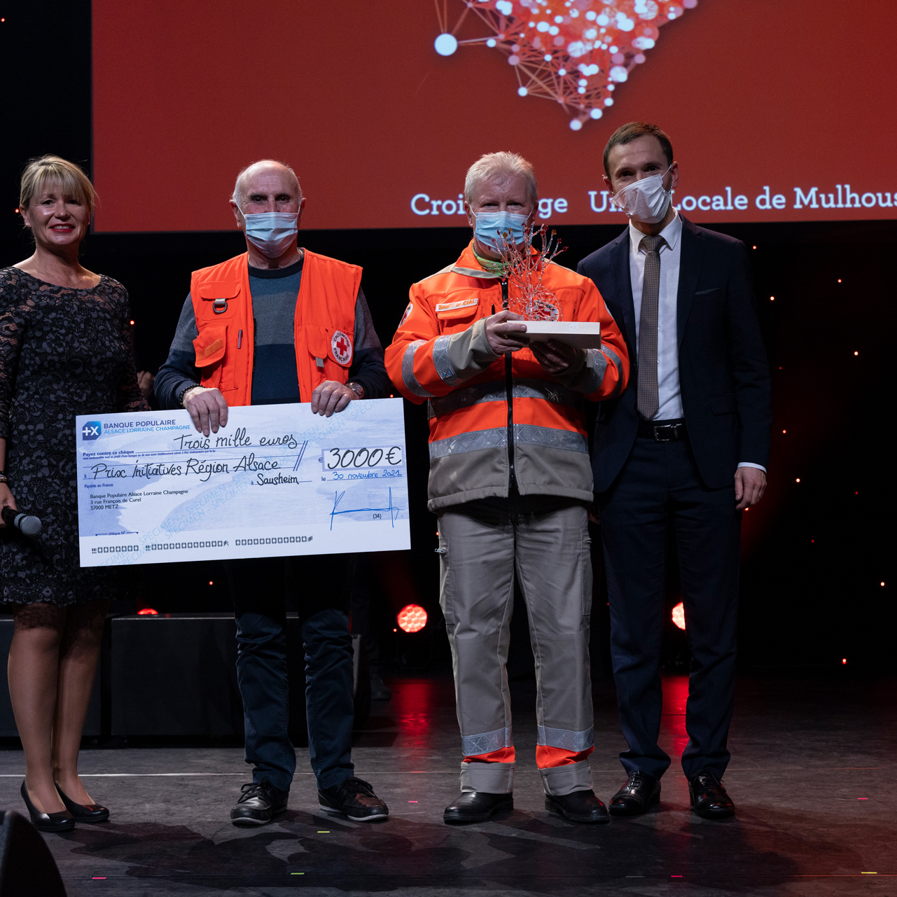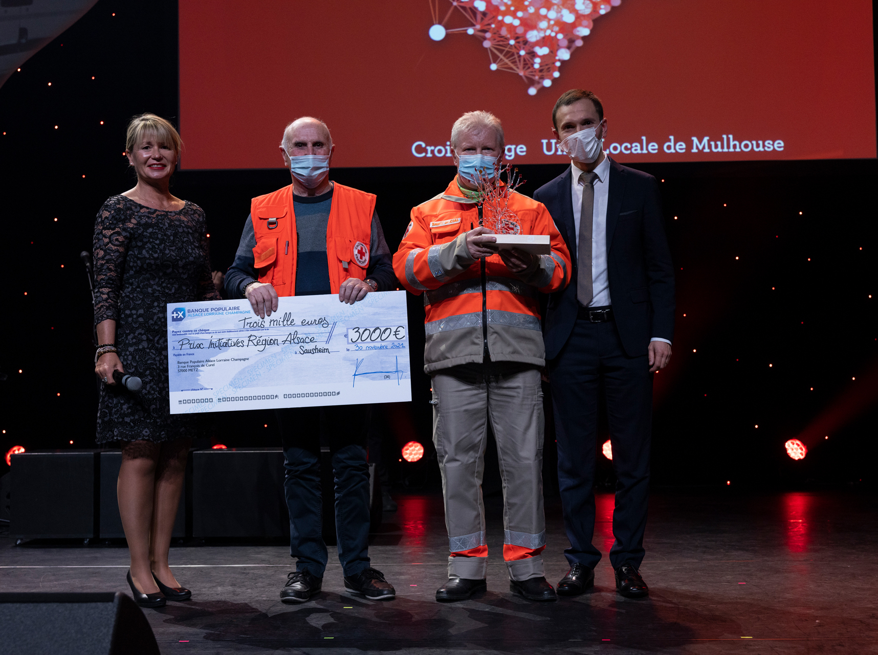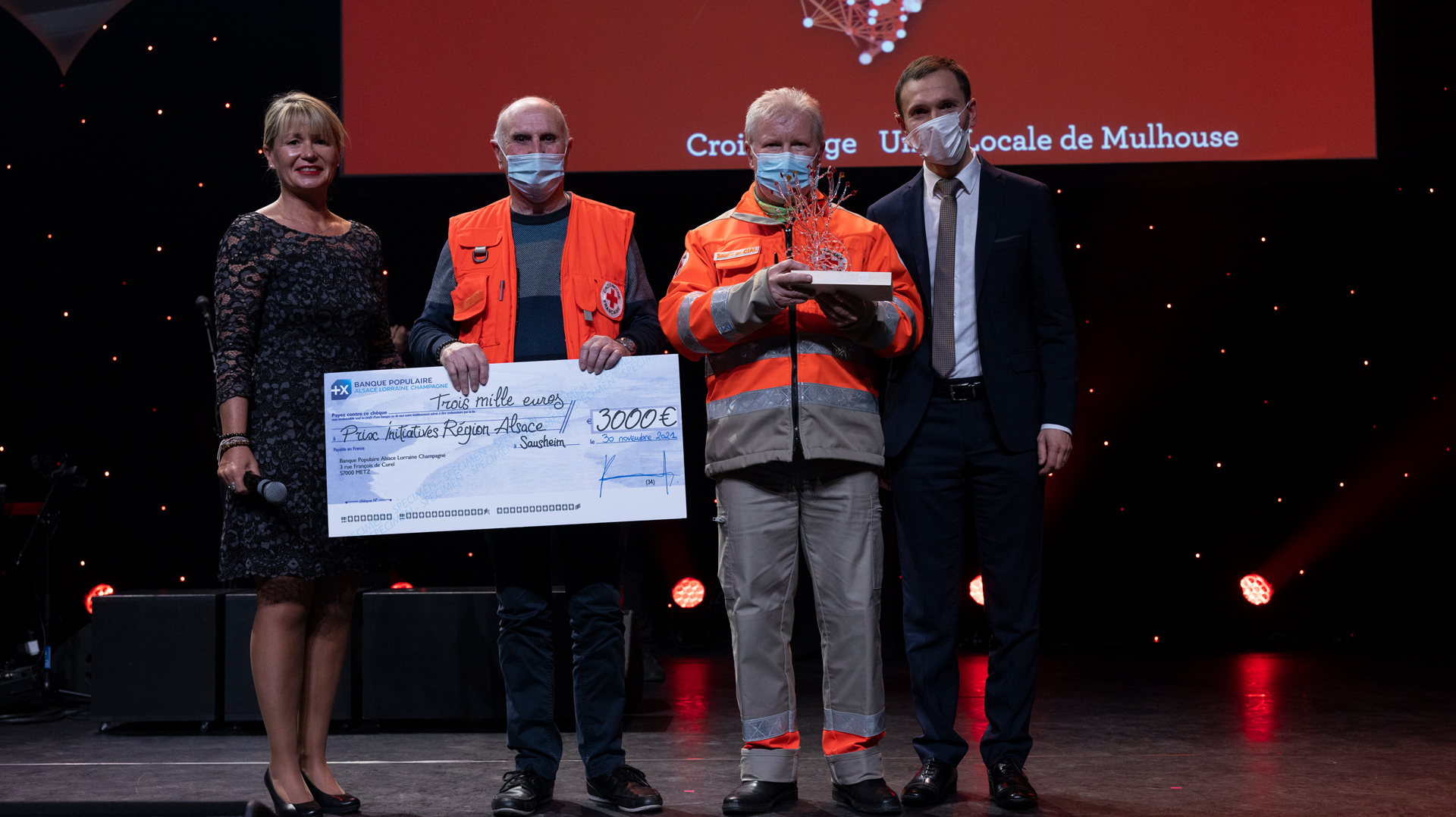 De gauche à droite : Nadine Gradoux, responsable Communication Institutionnelle de la BPALC, Francis Rambouilet et Gaby Klem, Unité locale de Mulhouse de la Croix Rouge et Noël Steinfeld, Directeur du département Haut-Rhin de la BPALC