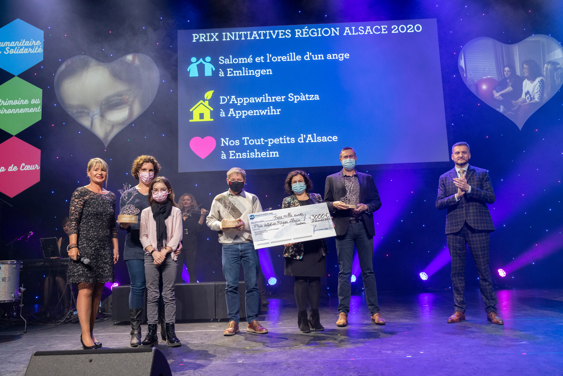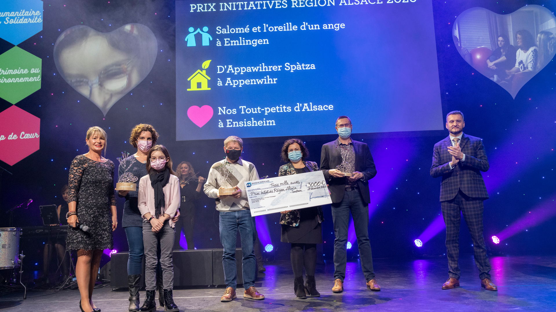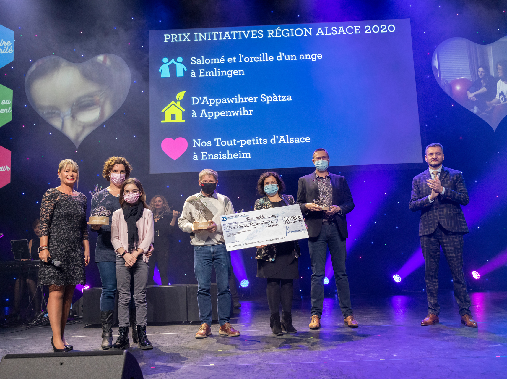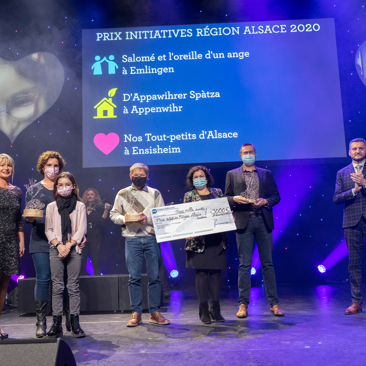 De gauche à droite : Nadine Gradoux, responsable Communication Institutionnelle de la BPALC, Christelle Volz, association Salomé et l’Oreille d’un ange, Roldolphe Metz, D’Appawihrer Spatza, Olivier Rasser et Mélanie Schneider, Nos Tout petits d’Alsace et Raphaël Dubs, Directeur de la Communication et du Sociétariat de la BPALC.