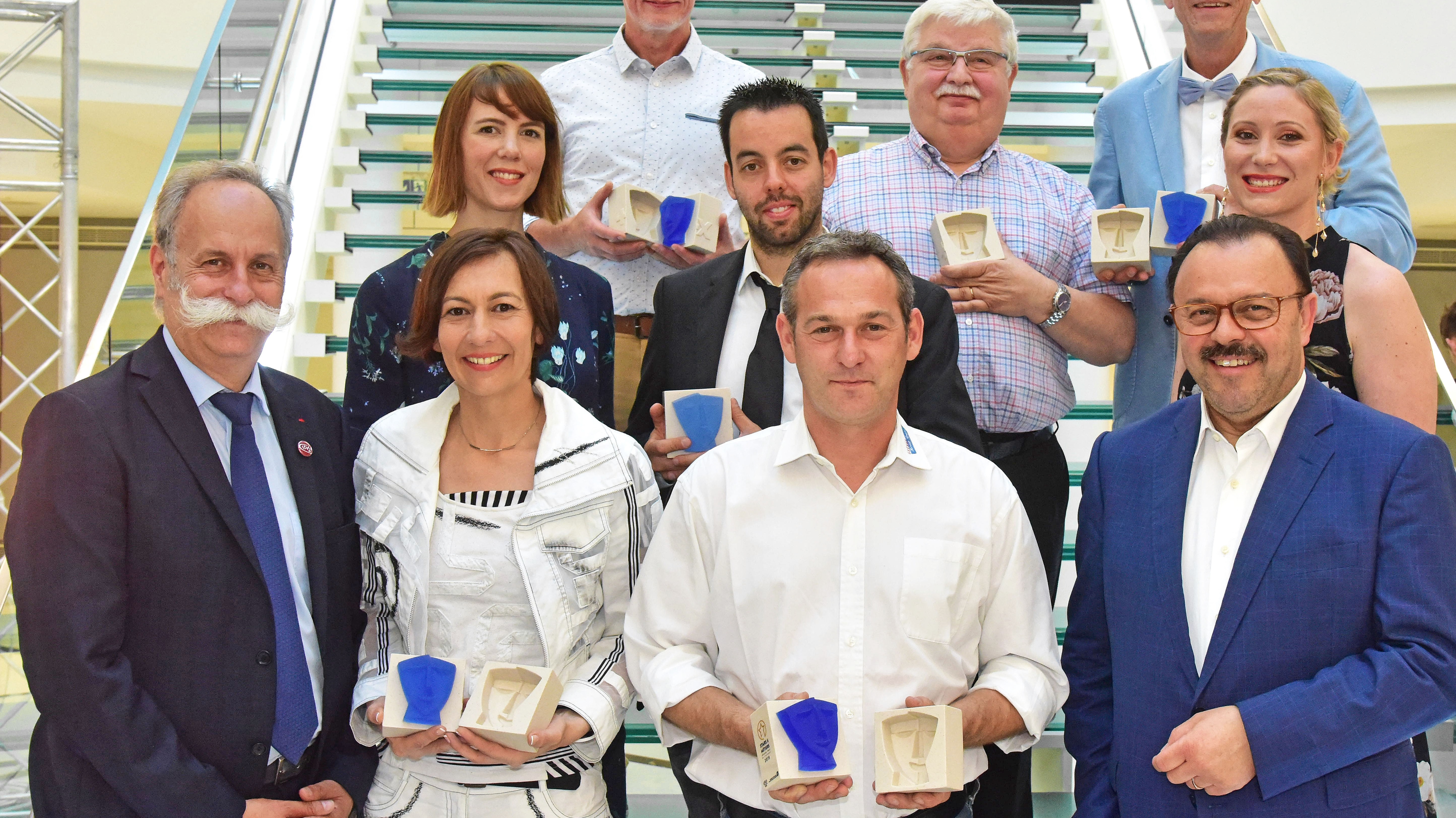 De gauche à droite : Bernard STALTER, Président de la CRMA Grand Est et Président de la CMA France, Maison DUTRIEZ A LA LORRAINE, NIMESIS TECHNOLOGY, SAS PLCD, Garage Bonne Route et Transports & Conseils HAECKLER Michel, Dominique WEIN, Directeur général de la BPALC et Audrey SCHMITT, Directrice du Marché des Professionnels à la BPALC