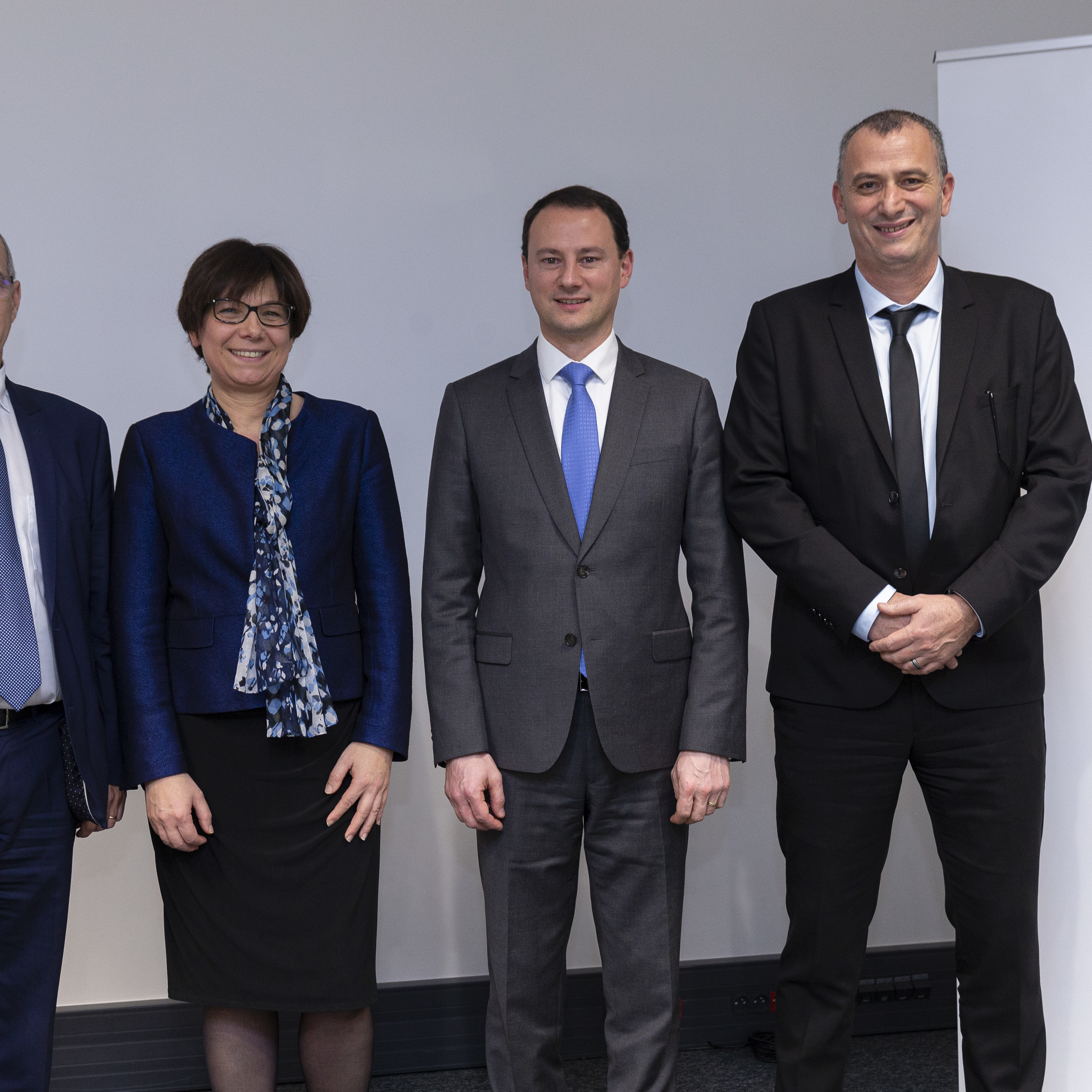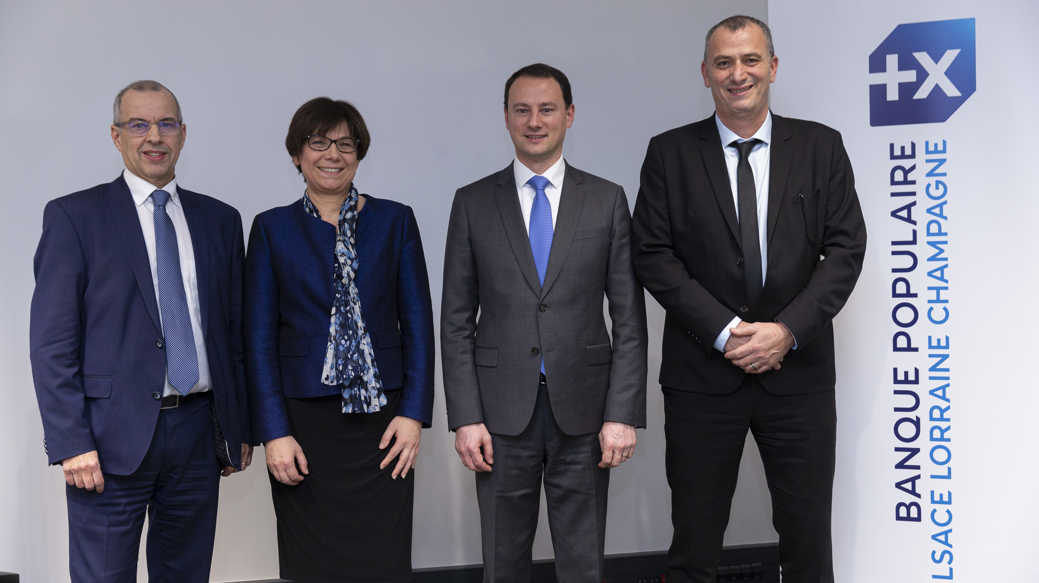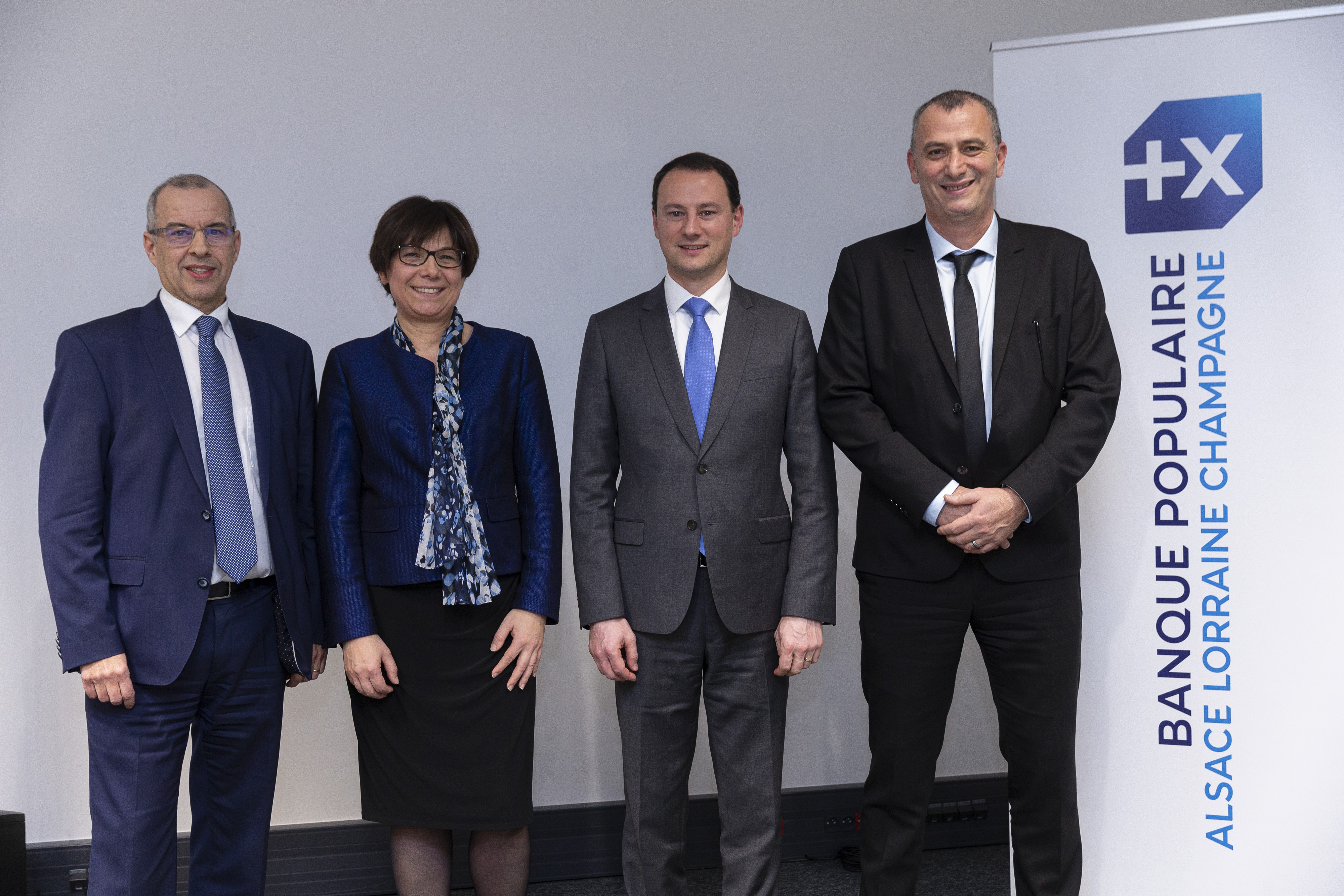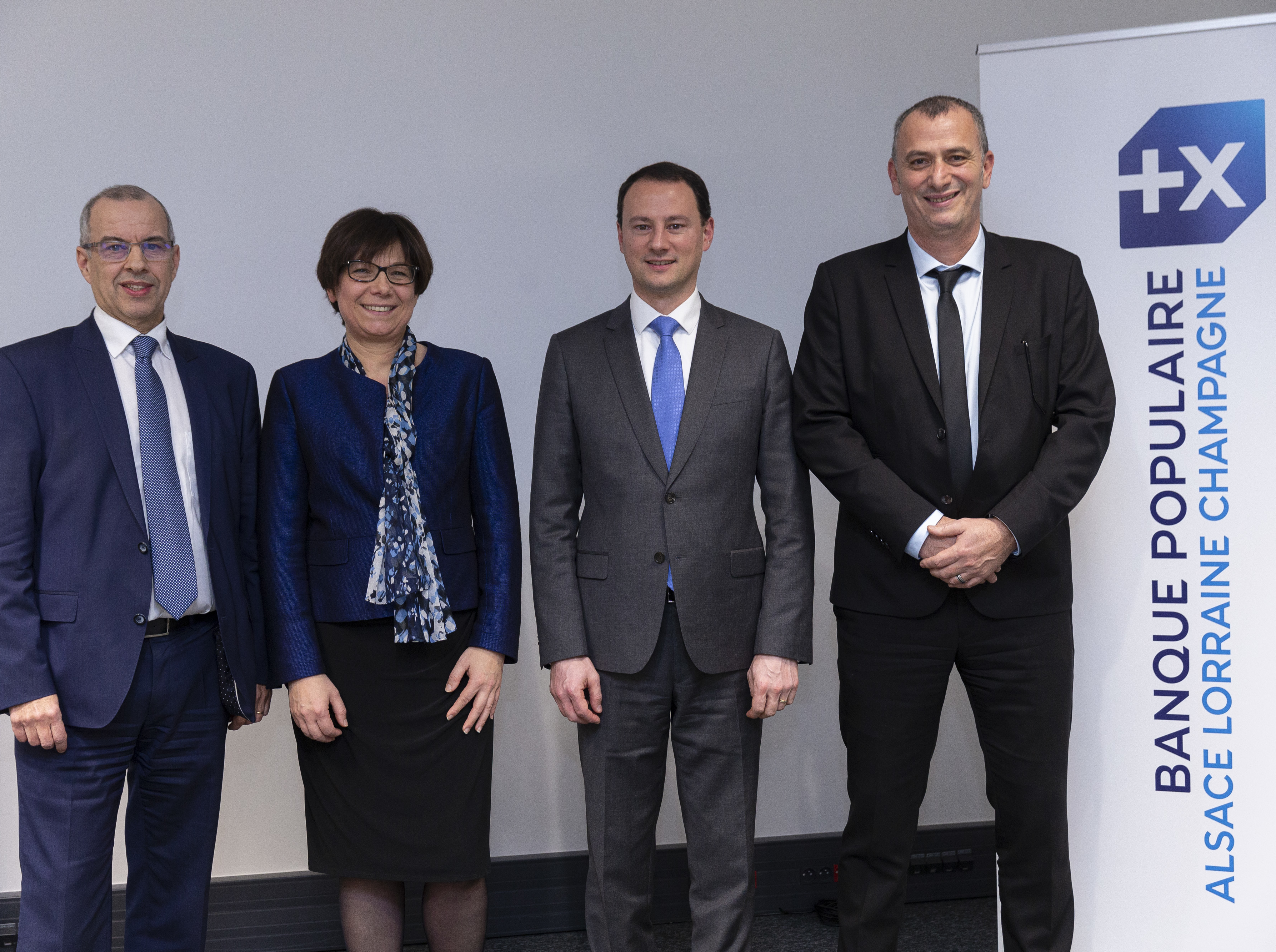 Aimé ADDED, Directeur Général Adjoint de la BPALC, Laurie PARIS, précédente Directrice du Département du Bas-Rhin, Anthony CLEMENT, Directeur du Réseau d’agences de la BPALC et Fabrice HAMRAOUI, nouveau Directeur du Département du Bas-Rhin.