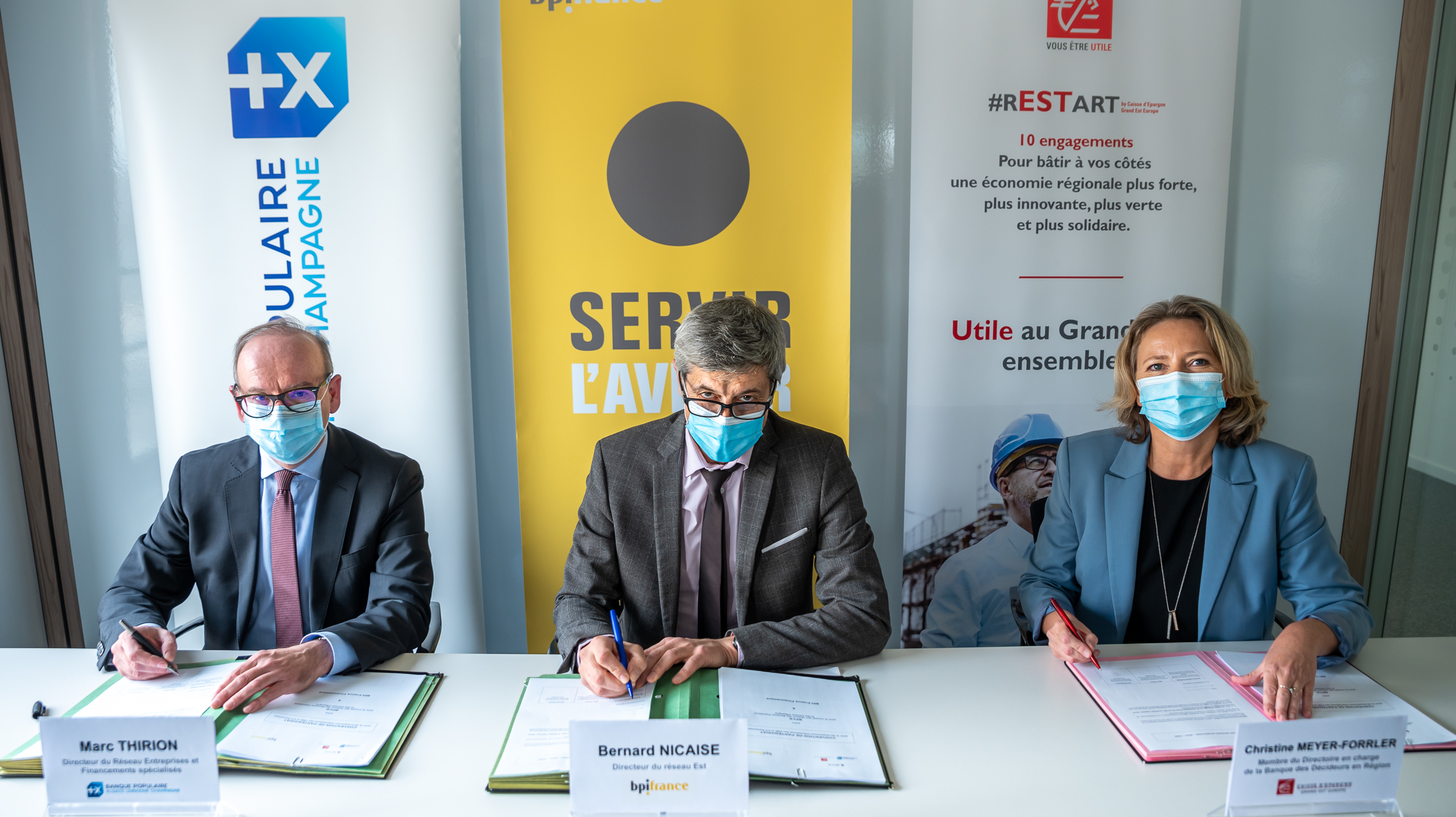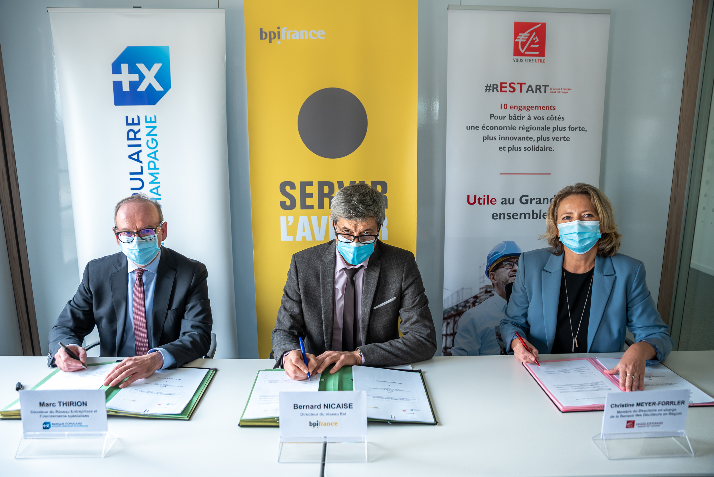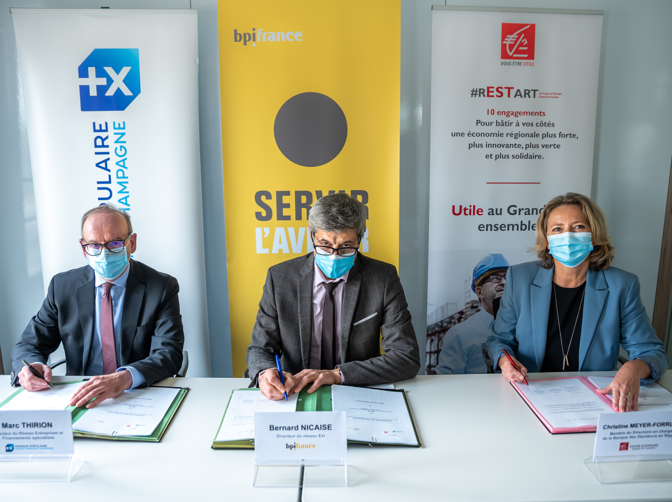 Marc Thirion, Directeur du Réseau Entreprises et Financements spécialisés de la BPALC, Christine Meyer-Forrler, Mandataire en charge de la Banque des Décideurs en région de la CEGEE et Bernard Nicaise, Directeur du réseau Est de Bpifrance