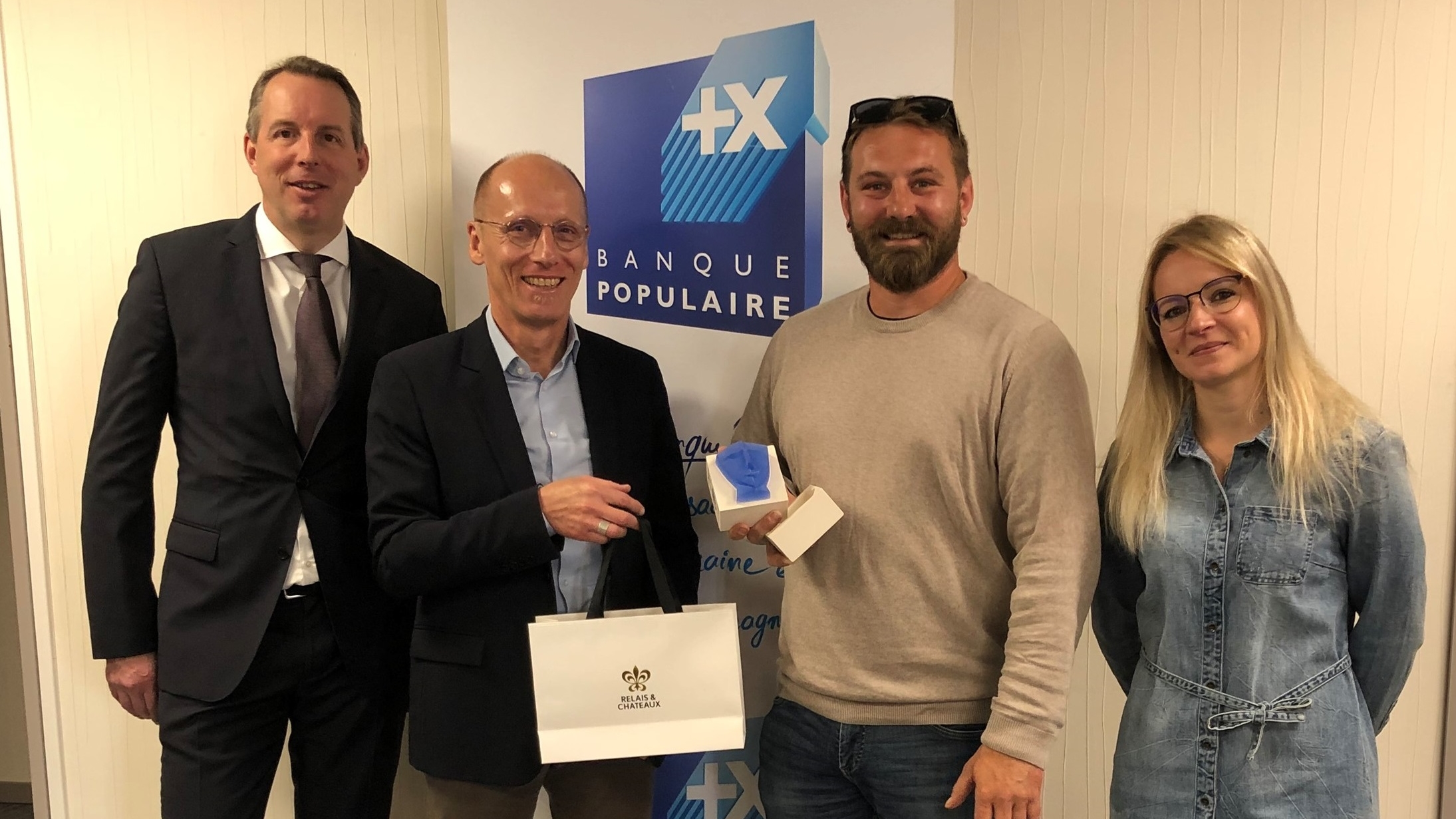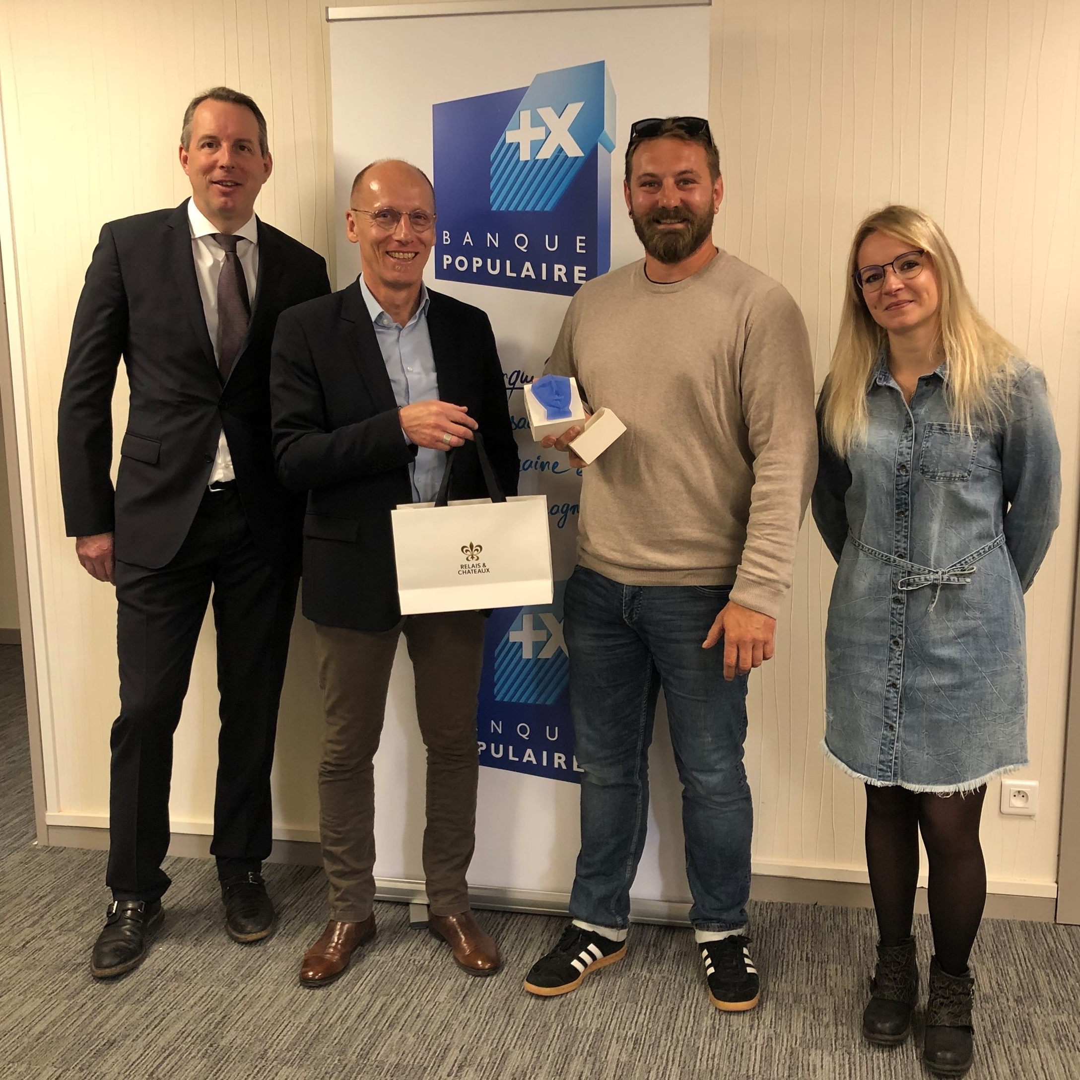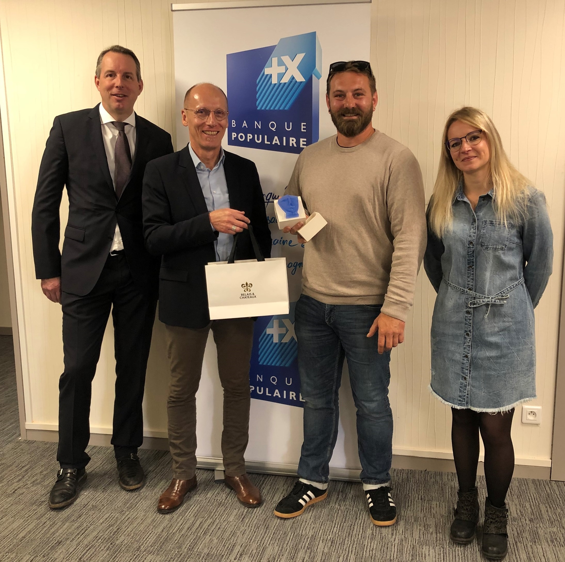 De gauche à droite : Albert De-Jonge, Directeur du Centre d'affaires Agri-Viti Alsace de la BPALC, Laurent Leroy, Responsable du marché Agri-Viti de la BPALC, Jean Dreyfuss et sa compagne Marie Panzer.