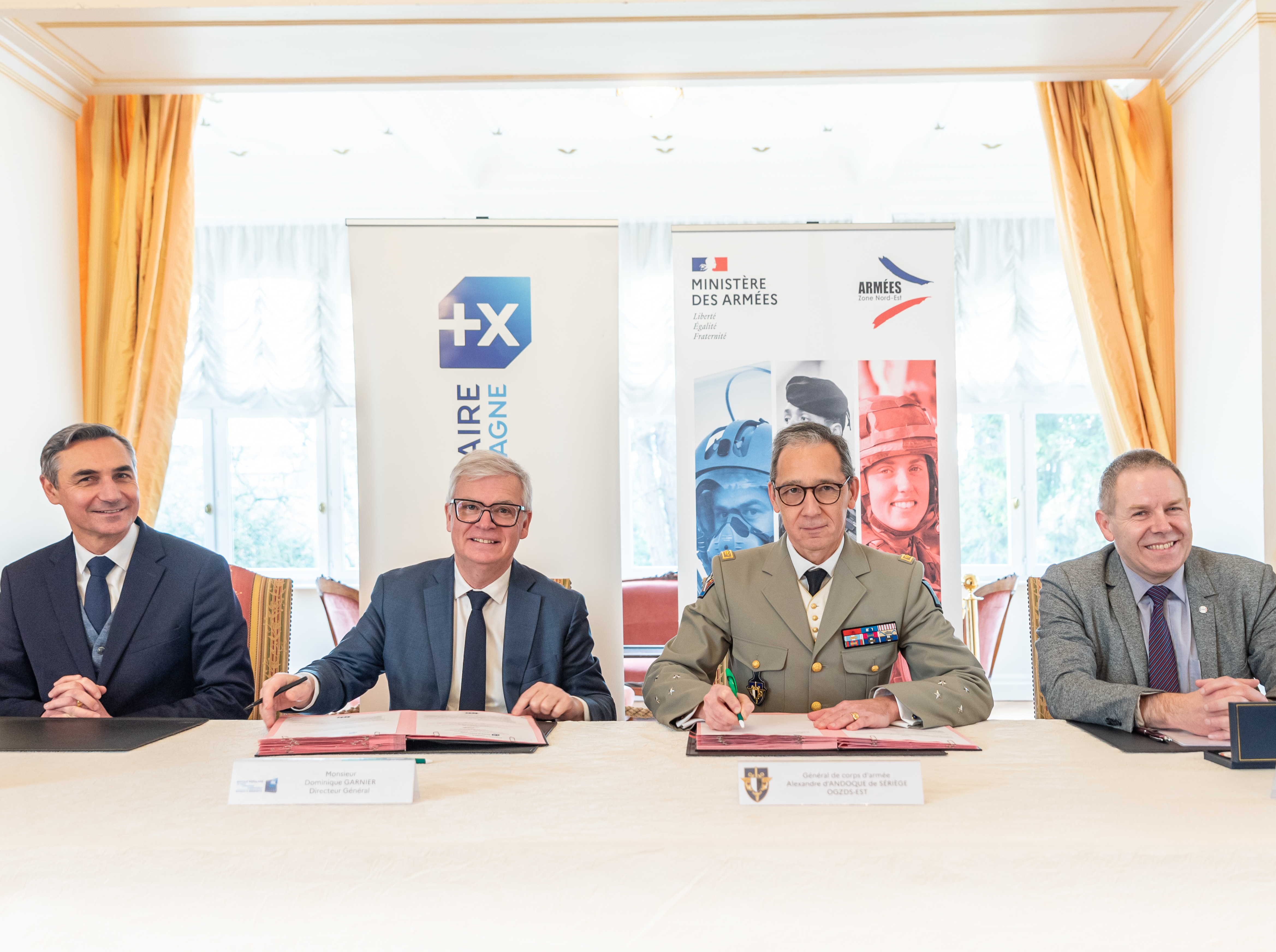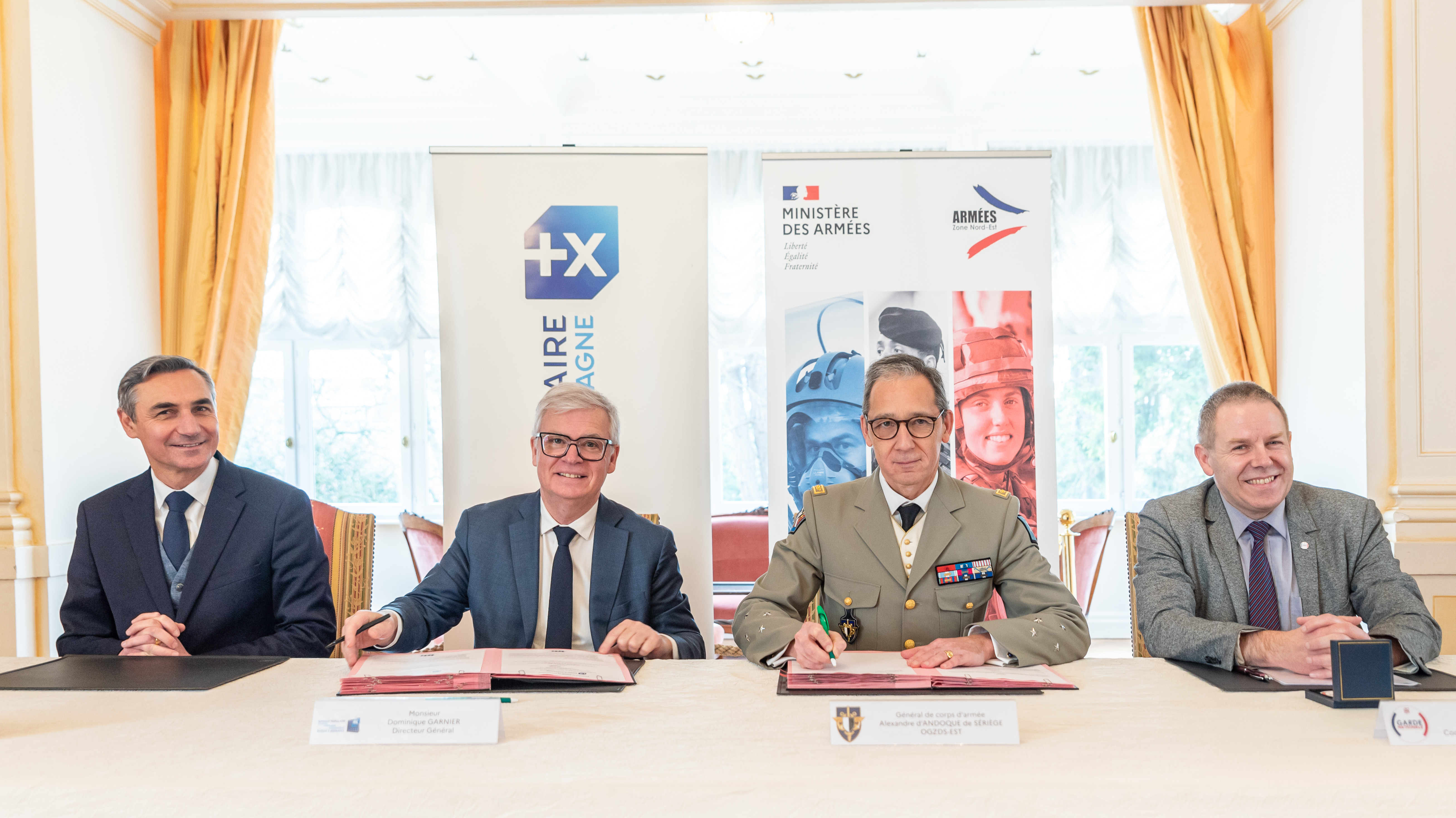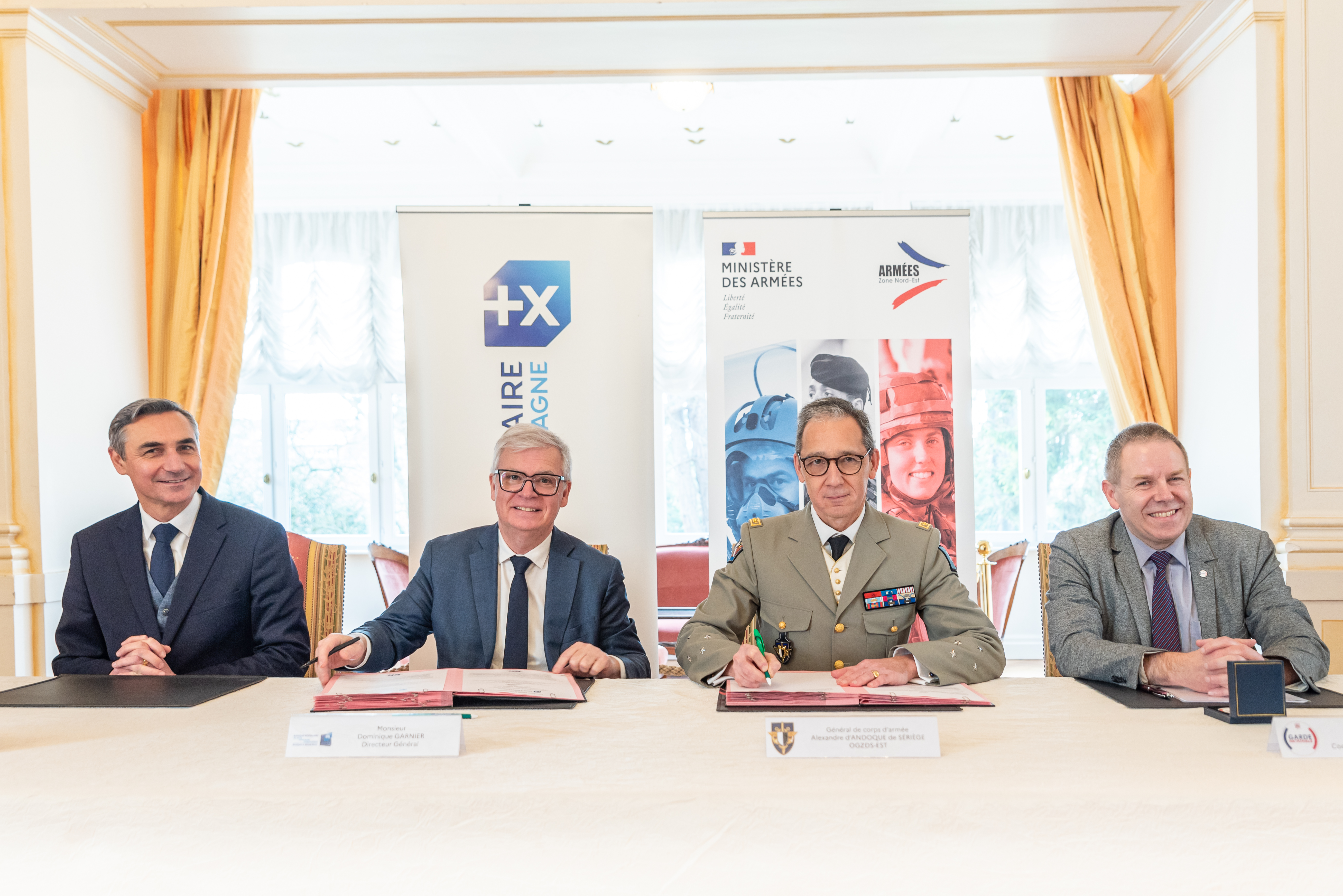De gauche à droite : Hubert De Marcellus, directeur général adjoint - Pôle Ressources Humaines & Transformation de la BPALC, Dominique Garnier, directeur général de la BPALC, Général de corps d’armée Alexandre d’Andoque de Sériège, officier général de zone de défense et de sécurité Est et Colonel (RC) Didier Scherrer, CRED / CGNE coordonnateur Zone Est.