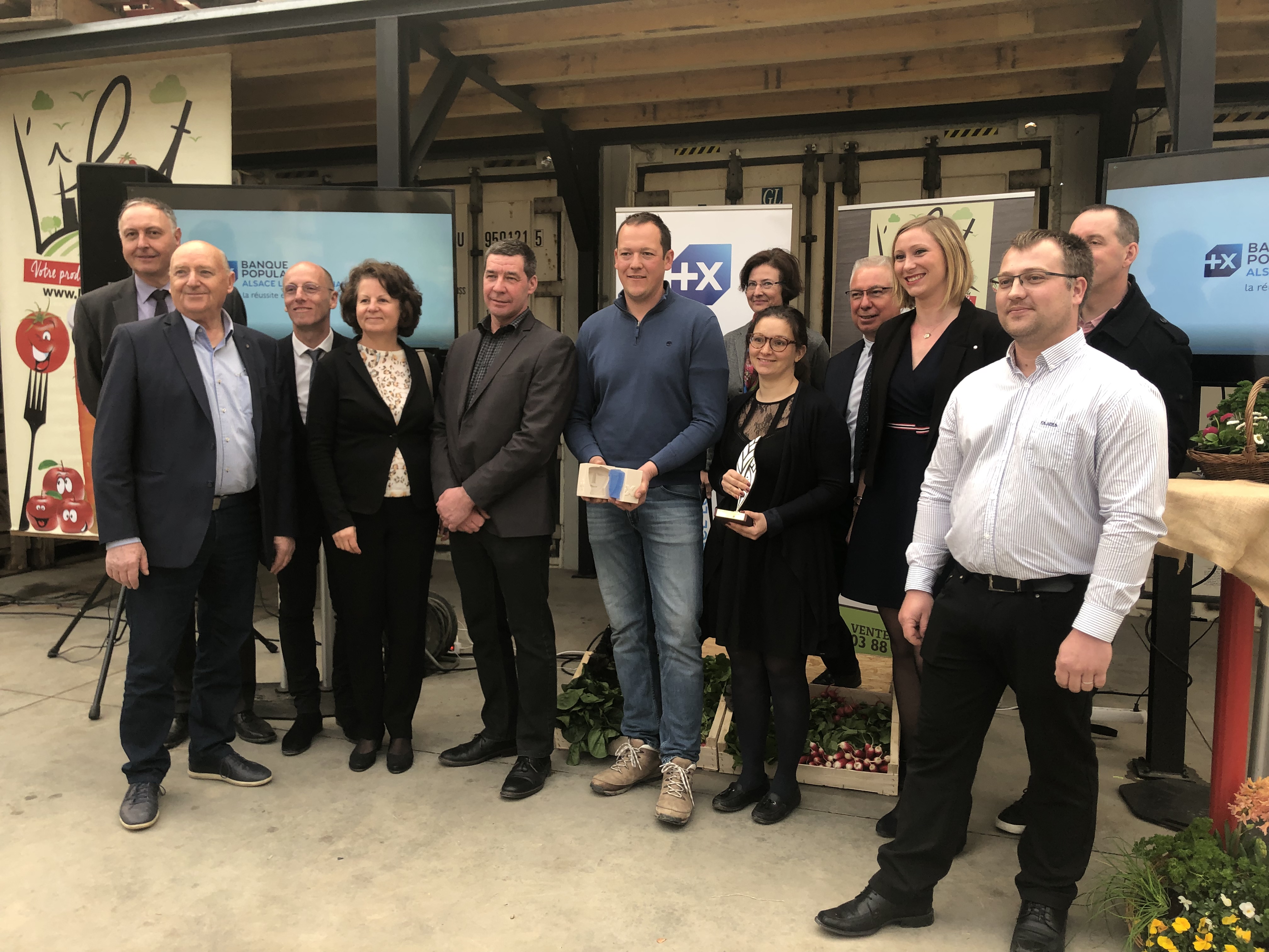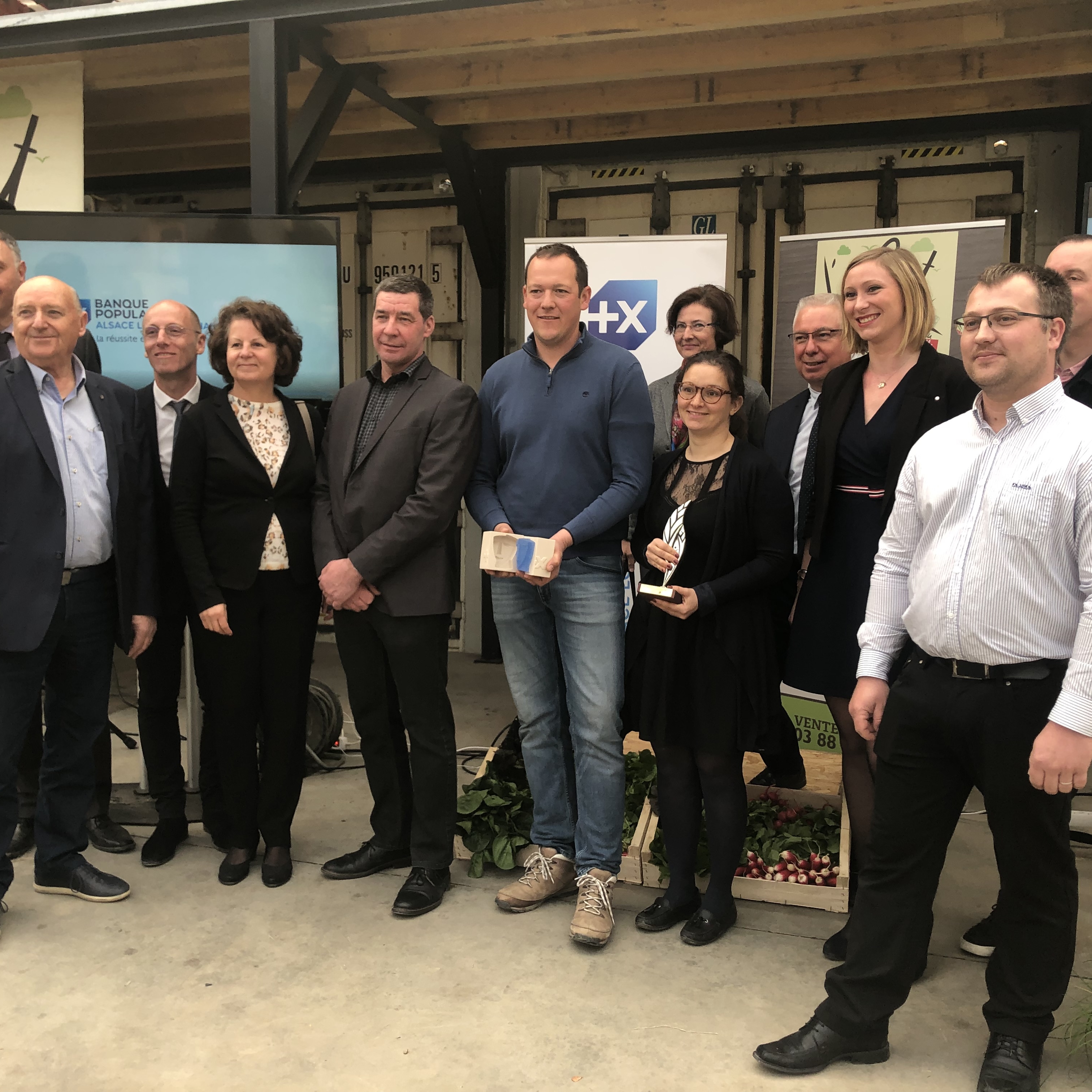 Claire et Geoffrey ANDNA de l'Îlot de la Meinau entourés des peronnalités du monde agricole alsacien et des remettants de la Banque Populaire.
