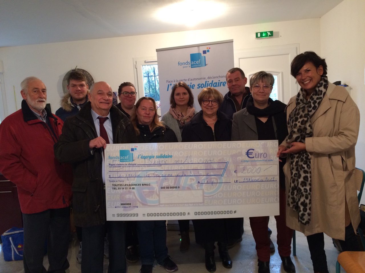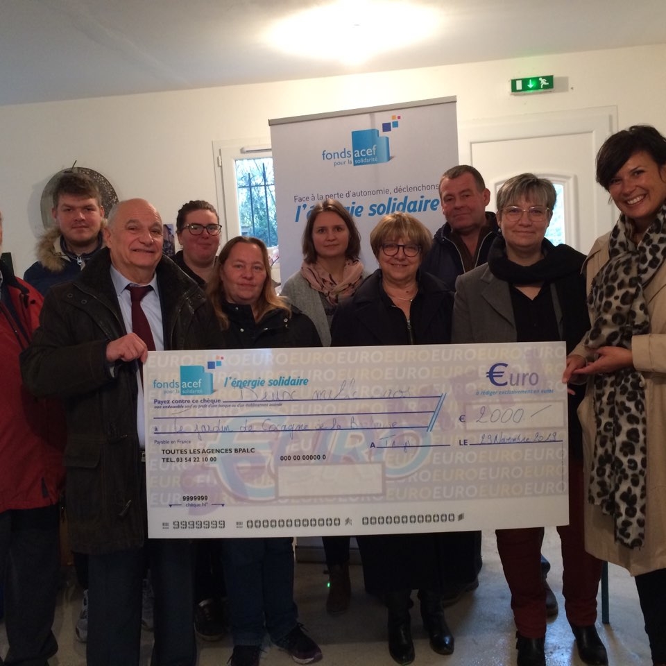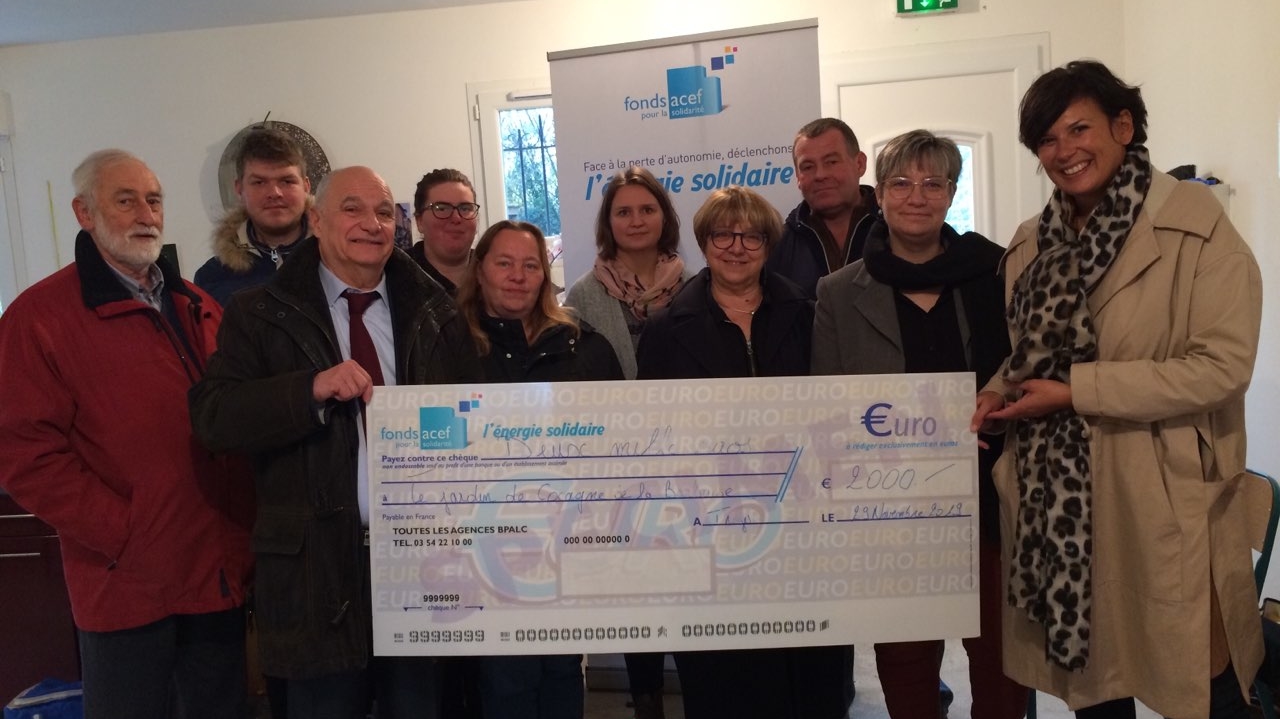 Remise d'un chèque de 2000 € du Fonds ACEF pour la Solidarité au Jardin de Cocagne de la Barbuise