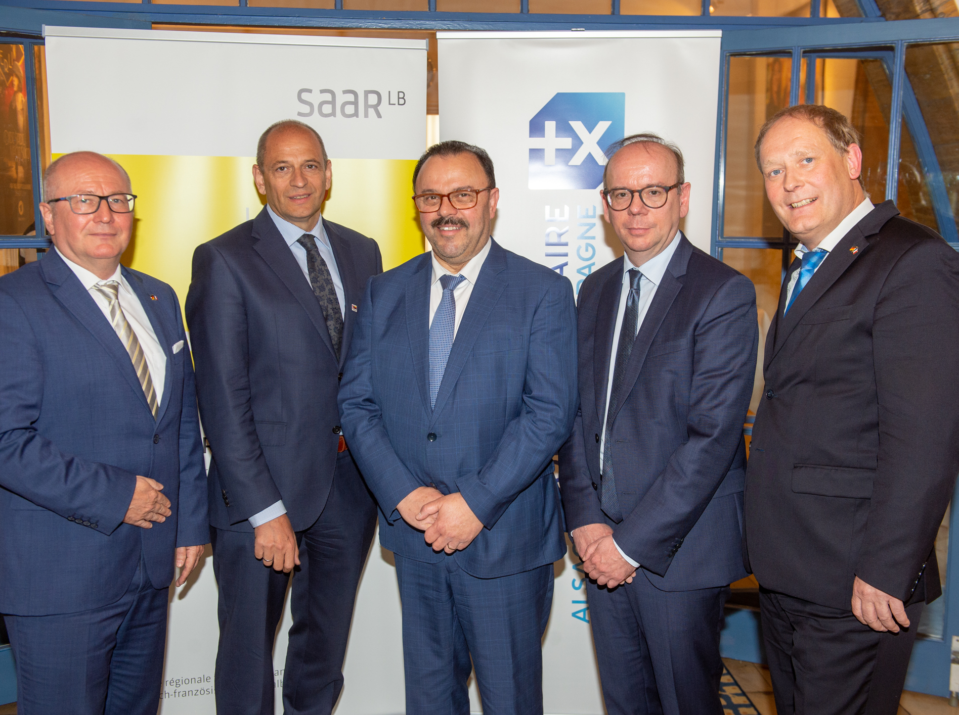 De gauche à droite : Frank ELOY, Directeur de marché de la SaarLB ; Thomas BRETZGER, Président du Conseil d’administration de la SaarLB ; Dominique WEIN, Directeur Général de la BPALC ; Marc THIRION, Directeur du Réseau d’entreprises et des Financements spécialisés de la BPALC ; Jochen LEGLEITNER, Directeur Général de la SaarLB.