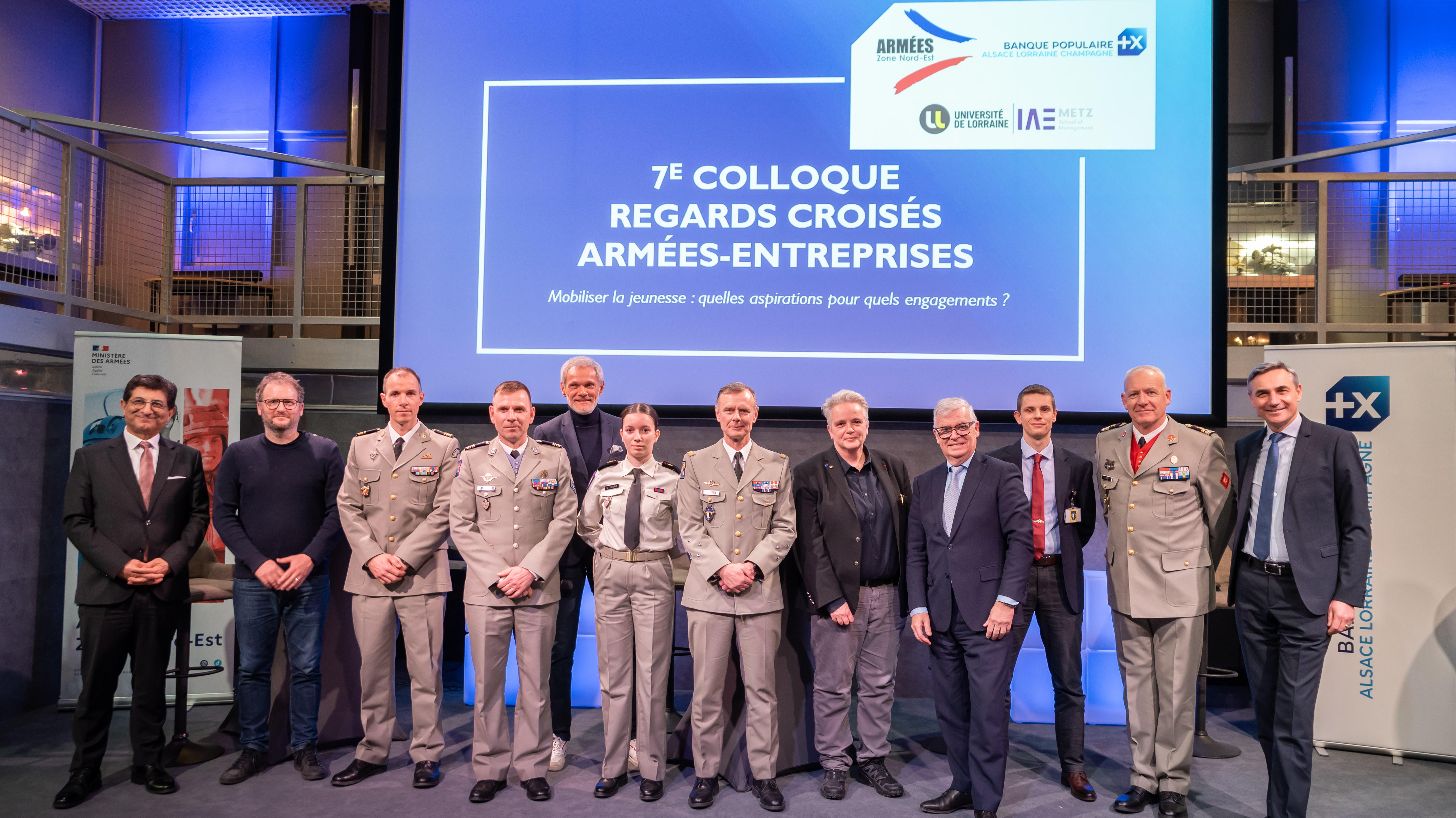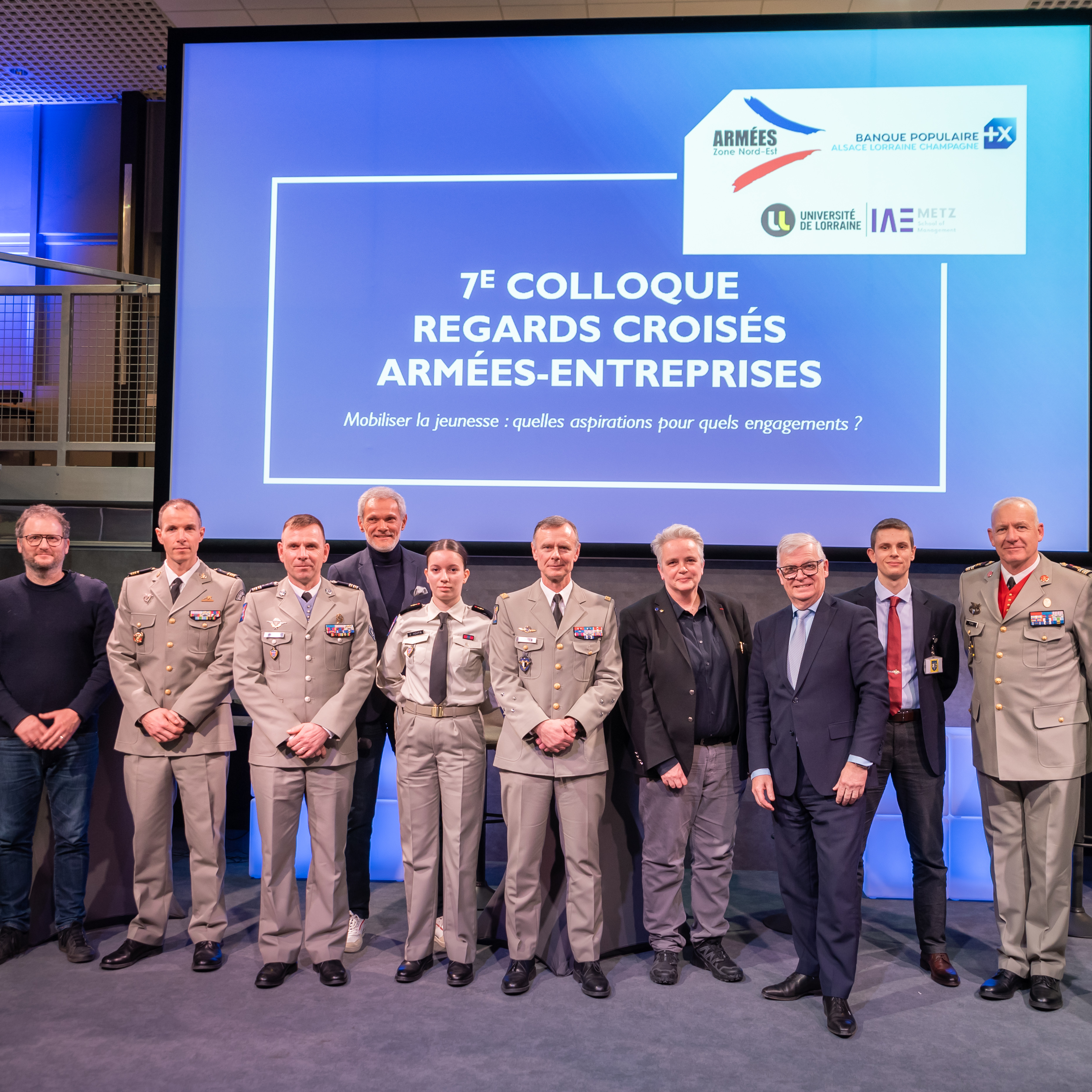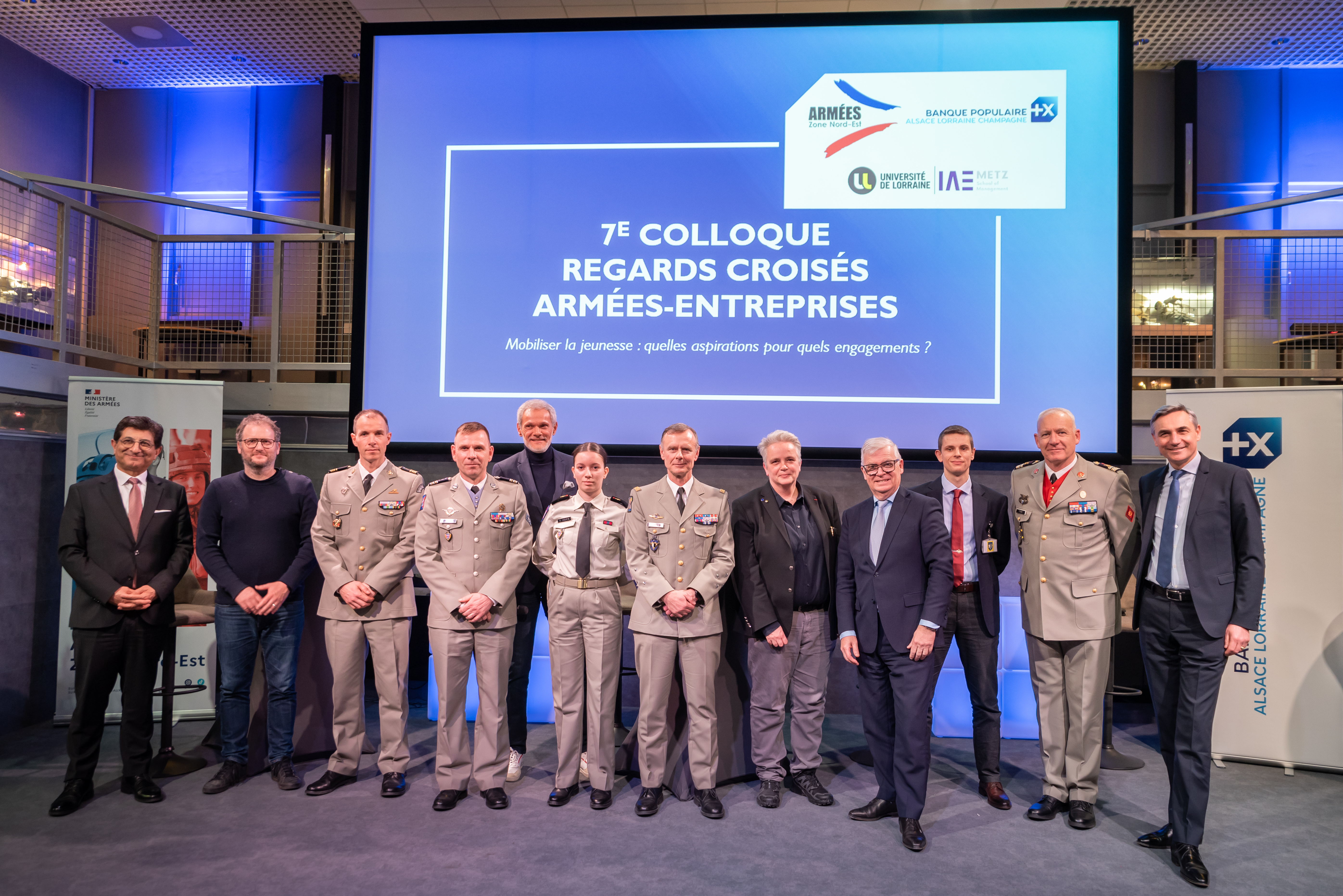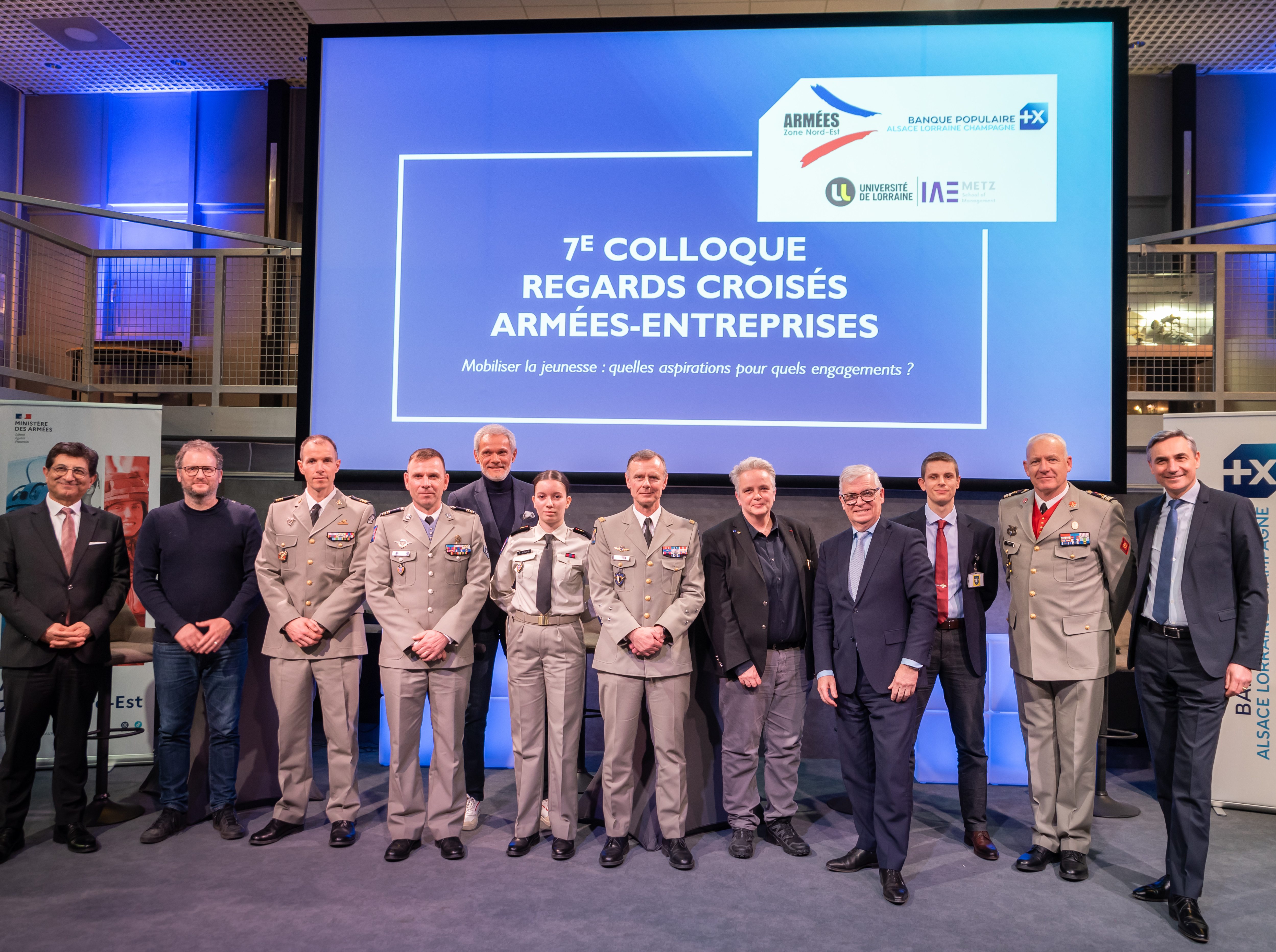 De gauche à droite : David ARSLAN, PDG du groupe PFF Façade, Romain LEBREUILLY, Docteur en psychologie et Maître de conférences à l’Université de Lorraine, LCL Fabrice OZANEAUX, chef de corps du 1er RSMV, CDT Rémi, Chef du département Evaluation du Groupement de Recrutement et de Sélection de Nancy, Guy KECKHUT, animateur, Sarah HOUPIN, volontaire du 1er RSMV, Général de corps d’armée Pierre MEYER, gouverneur militaire de Metz, Hélène BOULANGER, Présidente de l’Université de Lorraine, Dominique GARNIER, Directeur Général de la Banque Populaire Alsace Lorraine Champagne, Vincent LOHIER, Président des jeunes de l’IHEDN Grand-Est, LCL Patrick SIMO, Chef du Bureau Rayonnement-Relations extérieures de l’EMZD et Hubert de MARCELLUS, Directeur Général adjoint du pôle Ressources Humaines et Transformation de la BPALC.